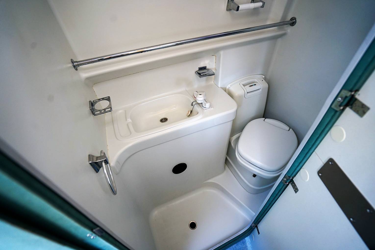 area. Opposite which sits a washroom with a good-sized sink, cassette toilet