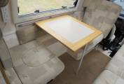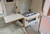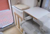 Kitchen area has ample worktop with additional drop down leafs to provide extra space, sink, hob with 2x gas rings, grill and 3-way fridge with freezer compartment. Heating and hot water are provided by an Erberspacher diesel fed system. This motorhome has a TV aerial, 240V power points, spot lighting, window blinds throughout, dining table for the lounge, cab air con and a porta potti. Lots of internal storage space.