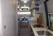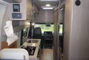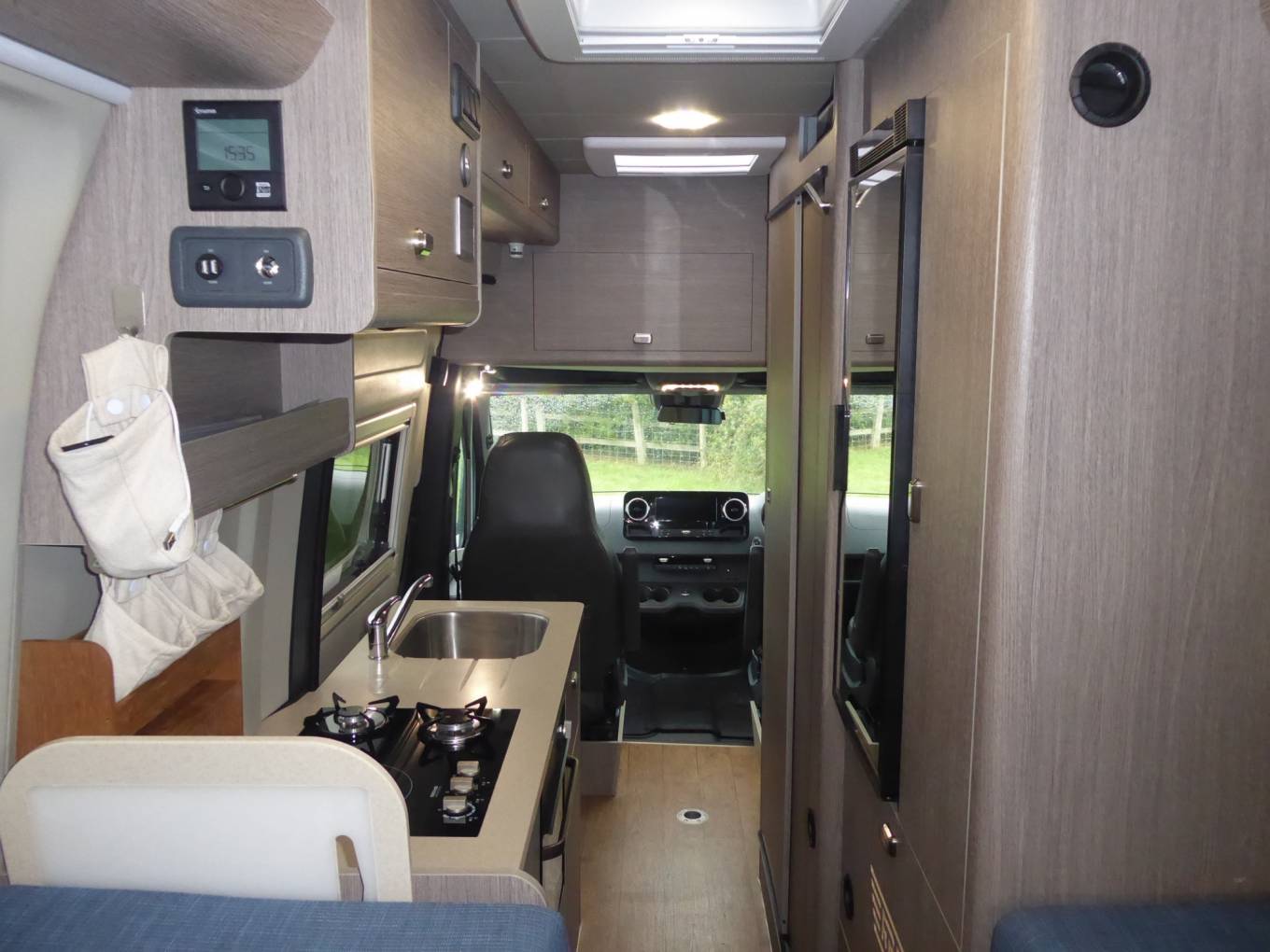 On the nearside, behind the side door is the kitchen with a sink, an extendable work surface, a hob with 2 gas burners and 1 induction plate, and a combination oven grill.