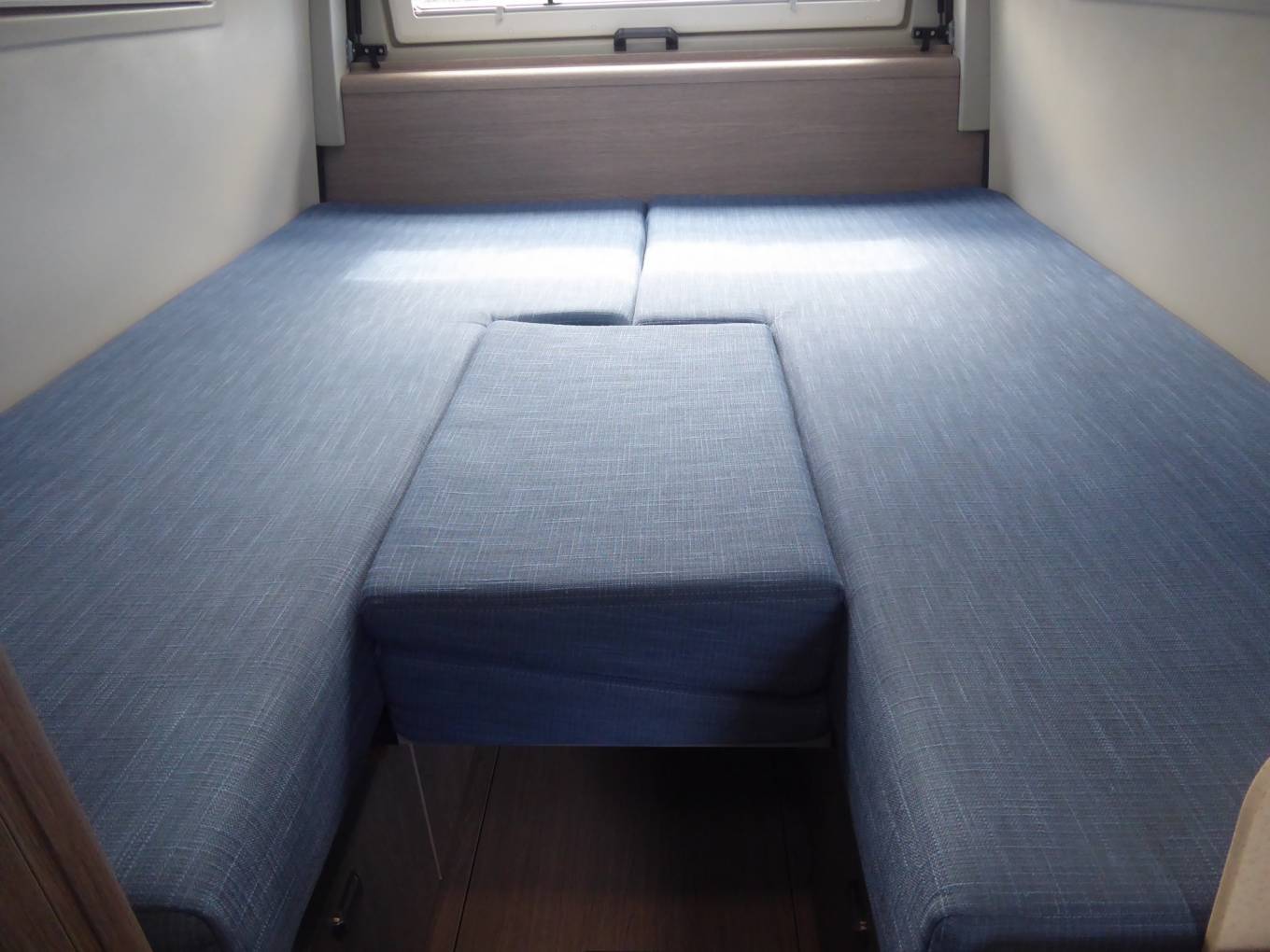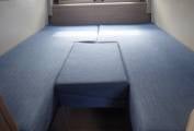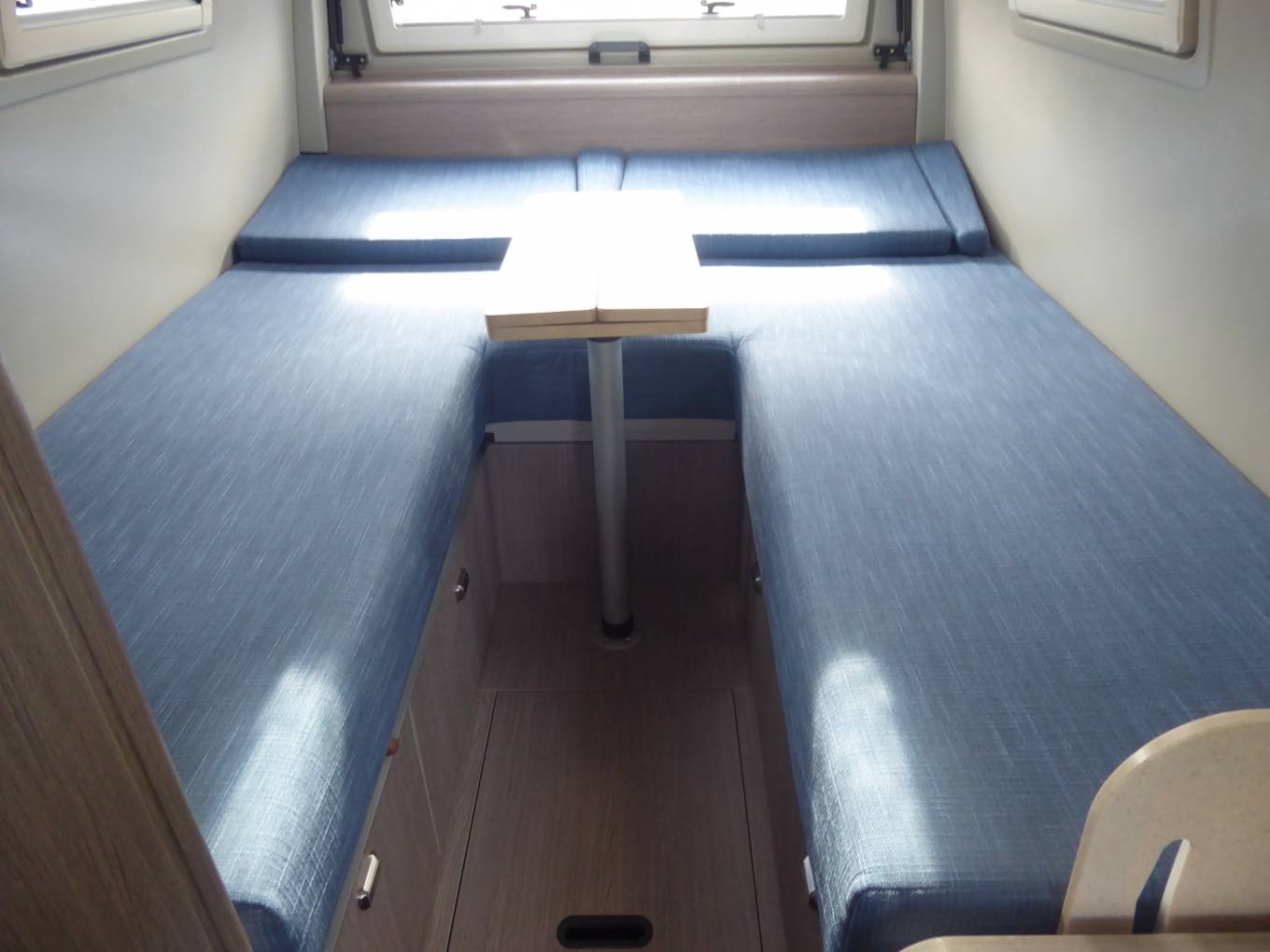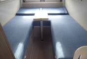 At the back of the vehicle is an airy, elevated U-shaped lounge with a folding removable table, above a spacious integral garage. This area features a rear opening panel. The lounge converts to two single berths or a double bed.