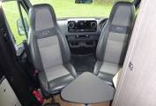 The cab benefits from an auxiliary remote controlled diesel heater (principally for the engine in cold alpine climates). The partial leather seats can be swivelled, and used with a dedicated removable small table.