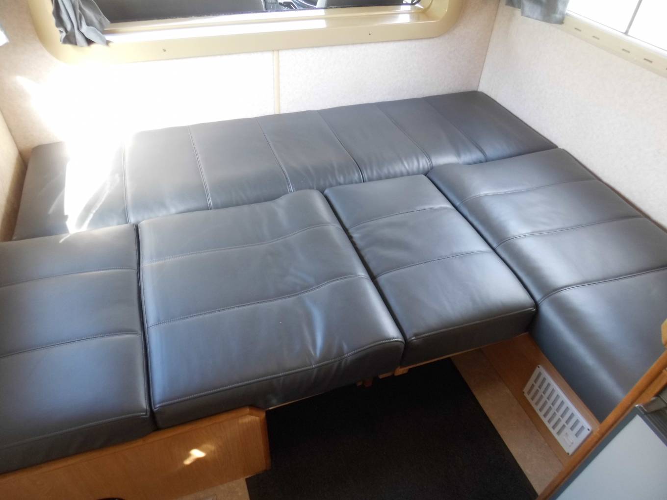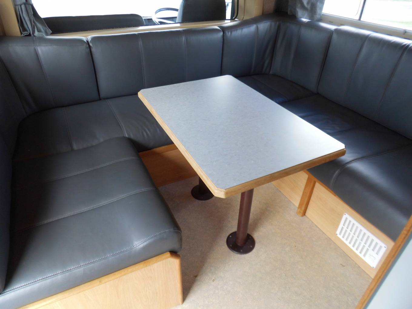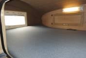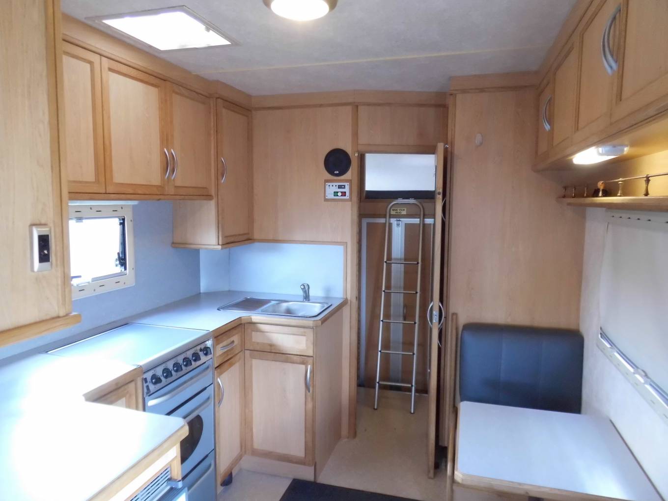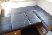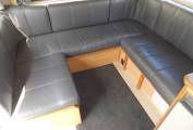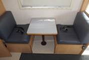 There is a dinette area opposite a very well-equipped kitchen which includes a Waeco fridge freezer, a full-size cooker/oven/grill, sink with mixer tap. There is an additional dining table stored in the bathroom to enable additional group dining in the main seating area. There is a double bed located in the pod above the cab and further sleeping options can be made up from the main U shape lounge.