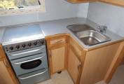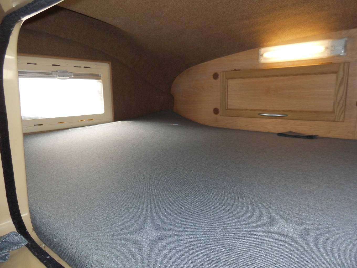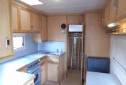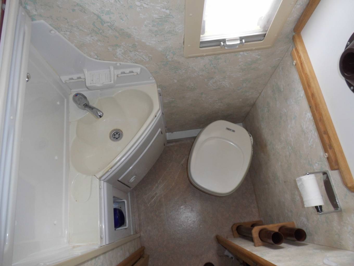 The washroom has a toilet, sink, vanity unit and there is a good-sized shower in a separate cubicle across the hallway. Beyond the washroom is a further double bed accessed by a ladder above the rear garage with small side window and some storage cupboards.