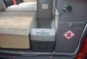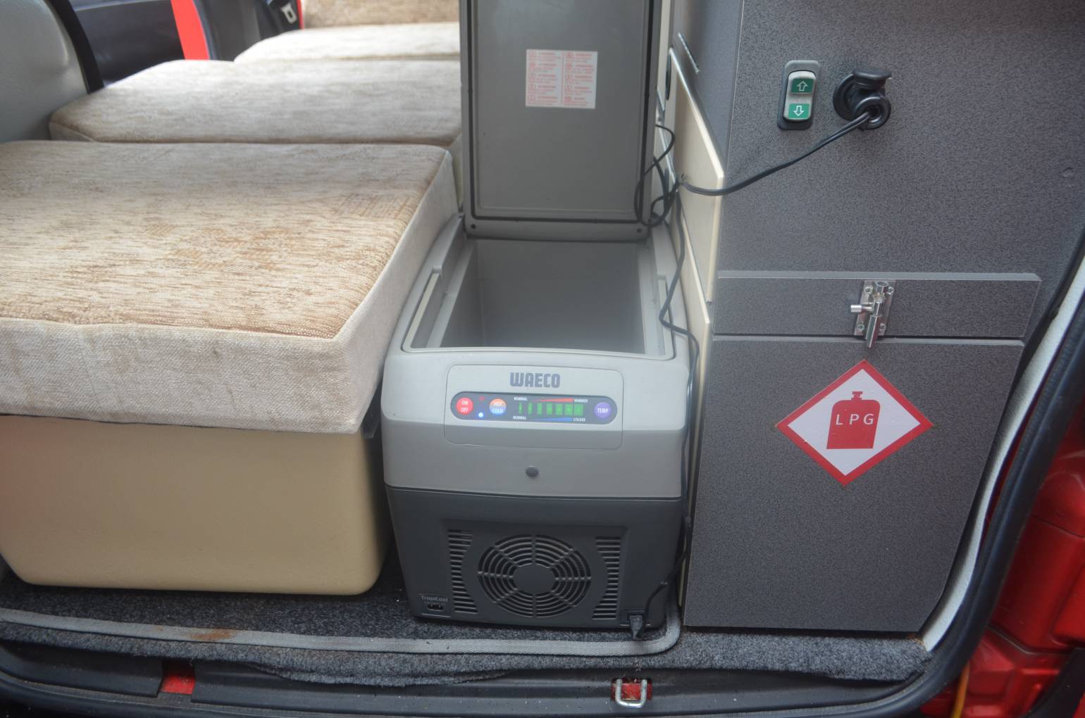 Kitchen area has a 2 burner gas hob, grill and a water storage container. The Waeco thermoelectric cooler fridge will work on hook up or leisure battery. The unique swing out sink unit has running water and gives you access to the porta potti. This area provides a platform to climb up into the elevated roof.