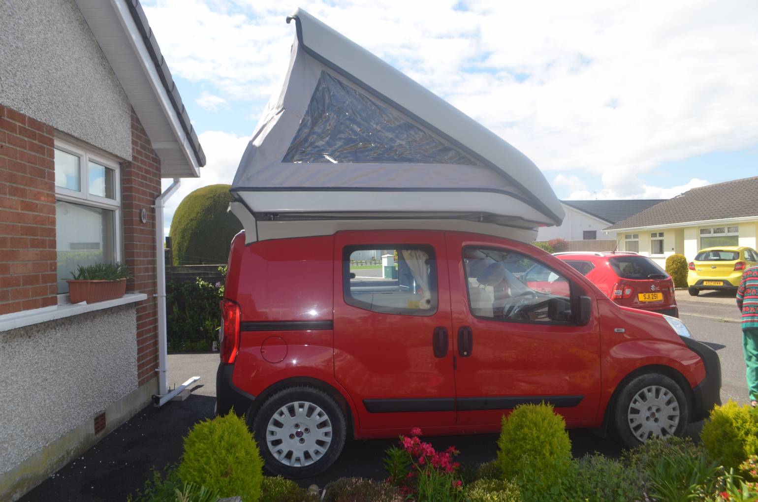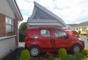 Skamper (Sky - camper) has an elevating roof design that can be raised by an electrical switch. You have 2 slide out bed trays with mattresses in place and large vents and windows built into the fabric of the roof. The other single bed can be converted in the habitation area from the travelling seats.