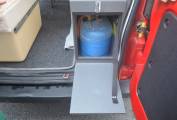 Underfloor storage locker holds the spare wheel. Storage lockers in the kitchen area for your travelling essentials and the gas bottle is housed at the rear opening door. Sliding doors on both sides of the habitation area.