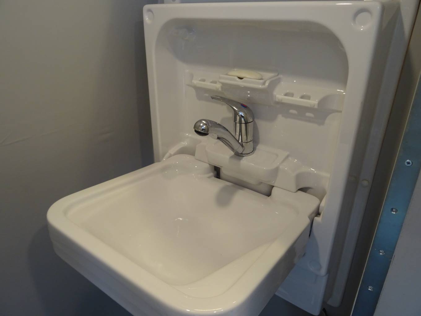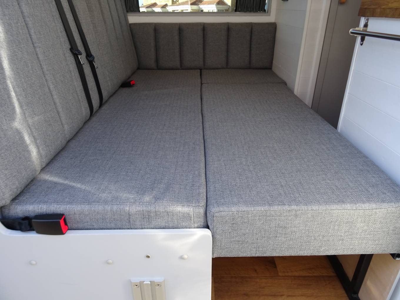 The habitation is entered by the sliding side door and on entering you will see immediately to the left a rear facing bench seat with 2 seat belts and a further single seat which constitutes part of the small double bed with the "infill" stored in the cavernous storage space underneath the fixed rear double bed. This seating area has a large skylight, a large swivel table which can be used on the move, when parked up as a dining table or an al fresco table when extended out of the doorway and under the large Fiamma awning with it's own LED striplight..