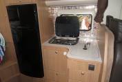 Moving back the Sun Living has a stylish kitchen area, please note that this is a continental van and so does not have and oven or grill, it does come with hob with three gas burners, sink with mixer tap and large fridge with separate freezer.