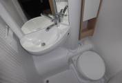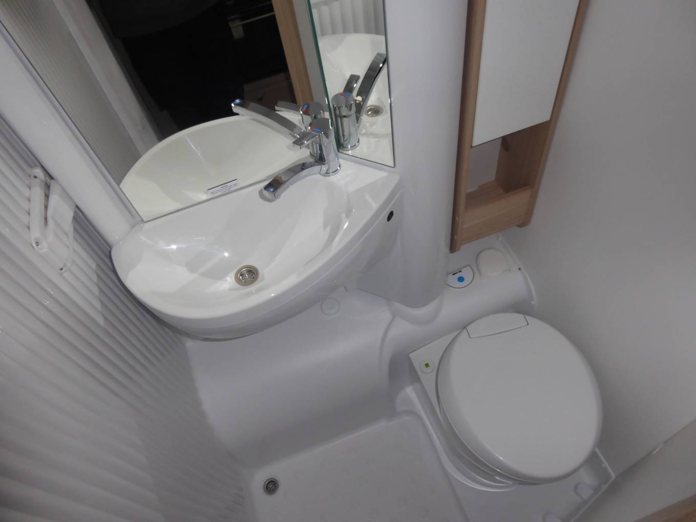Behind the double seat is a wetroom with a toilet, hand basin, and screened shower.