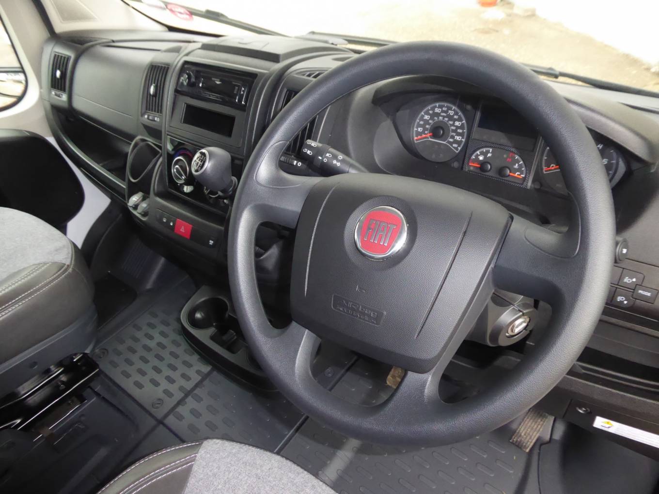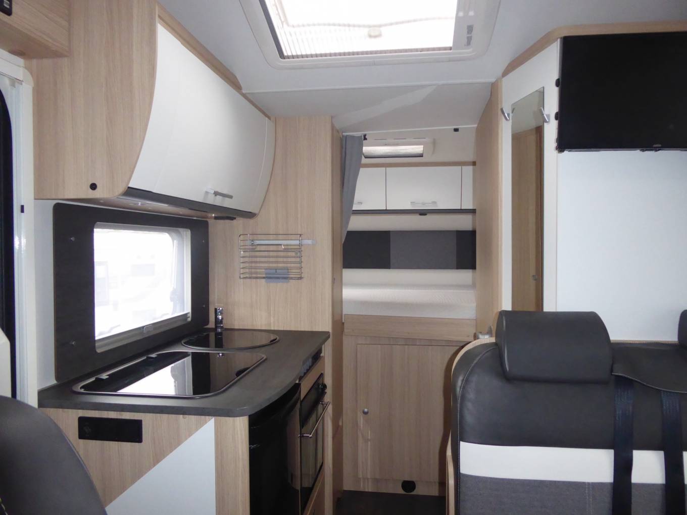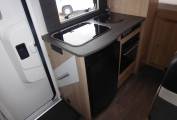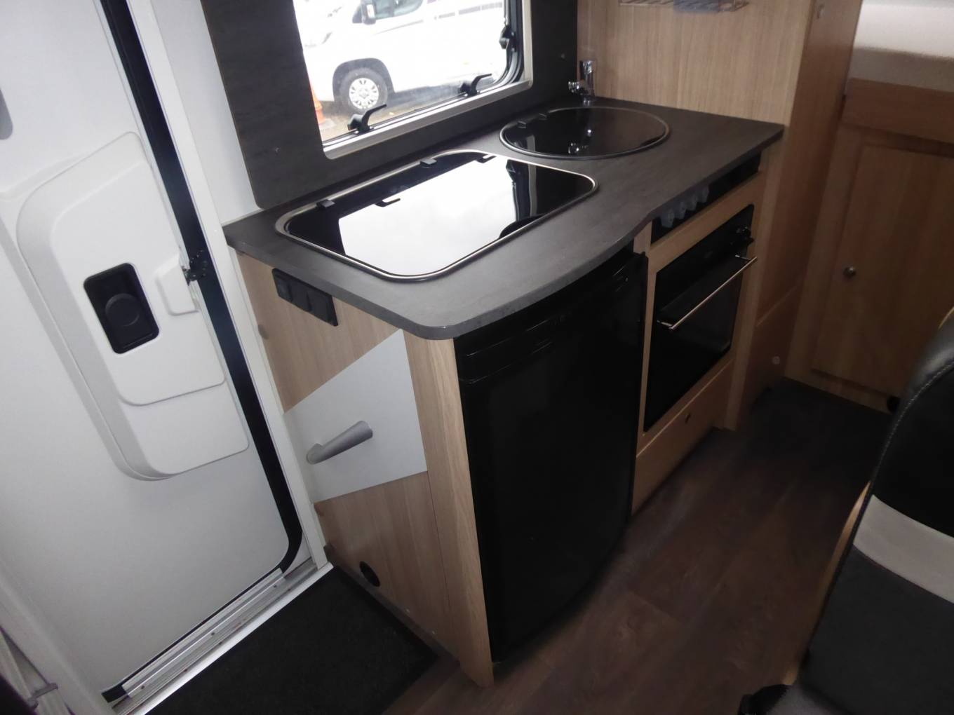 On the offside behind the cab is the habitation door, followed by the central kitchen that features a 3-burner gas hob, a combination oven/grill, a sink, and fridge with a freezer box. A floor to ceiling locker space is located next to the kitchen.