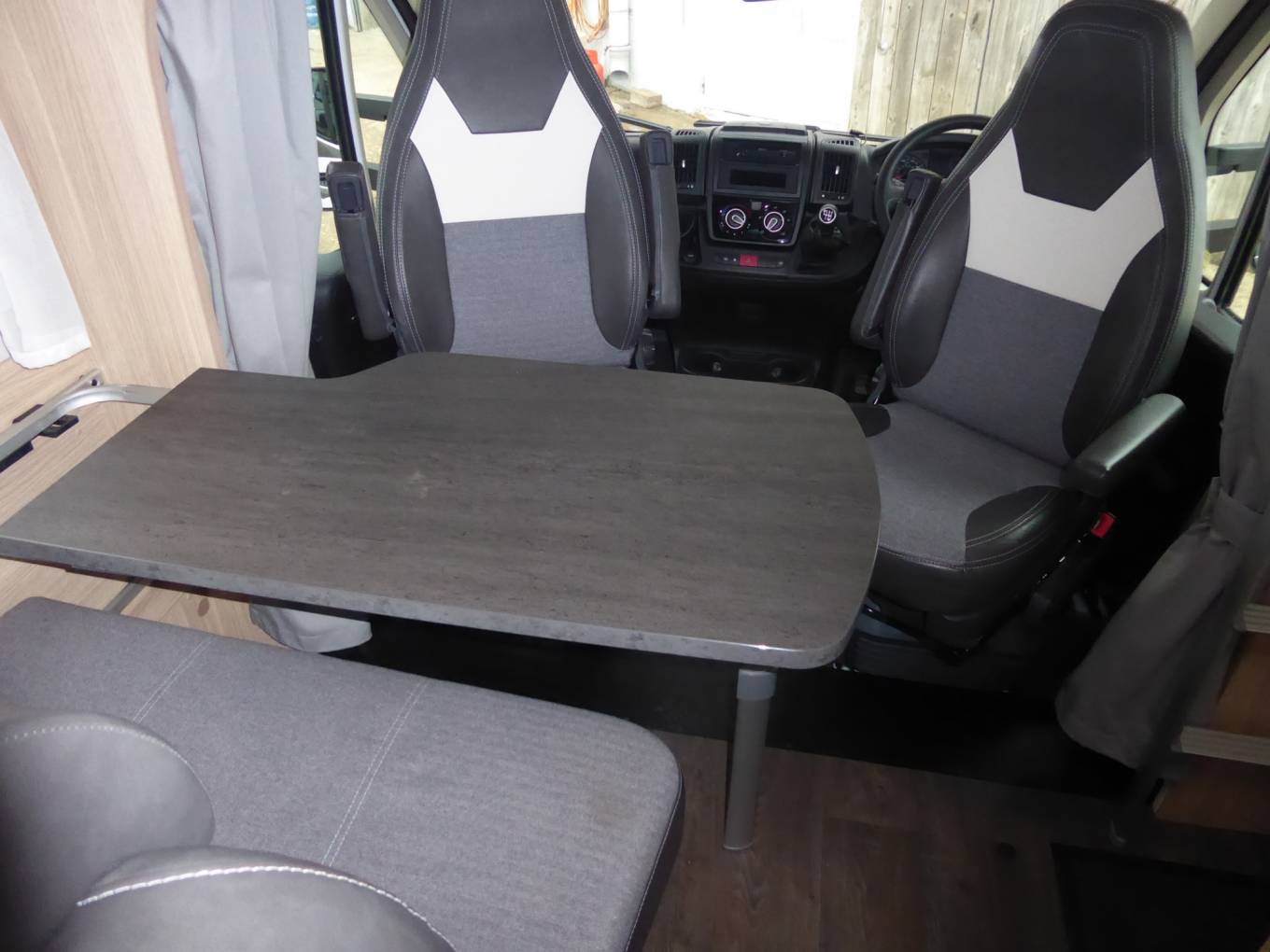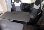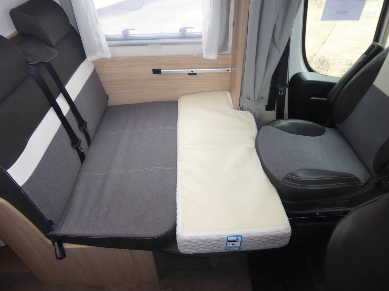 Above the cab is a split-lift double berth. The cab seats below can be rotated to augment use of the forward facing double seat (with two additional seat belts) and table that are found behind the passenger cab position.