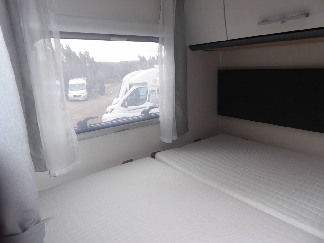 At the rear of the motorhome is a transverse French bed above a large storage area that can be accessed internally, or from either side externally.