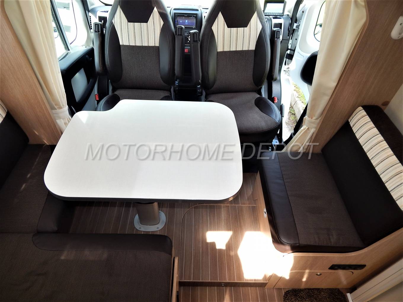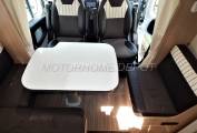 We enter the Motorhome on the drivers side immediately opposite is the dinette with an L shaped sofa the forward facing part has 2 x 3 point lap & diagonal seat belts for travelling passengers. There is a single seat to the right of the habitation dppr with a central telescopic drop down table, the front two seats rotate to join this area so you could easily seat 6 people if entertaining on site.