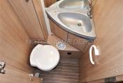 Moving rear there is a divided washroom across the middle of the motorhome: with Thetford cassette toilet, vanity unit, washbasin, opposite a separate shower cubical with perpex doors to close and rooflight. The toilet door can close the whole bathroom area from the habitation area giving a private place to dress.