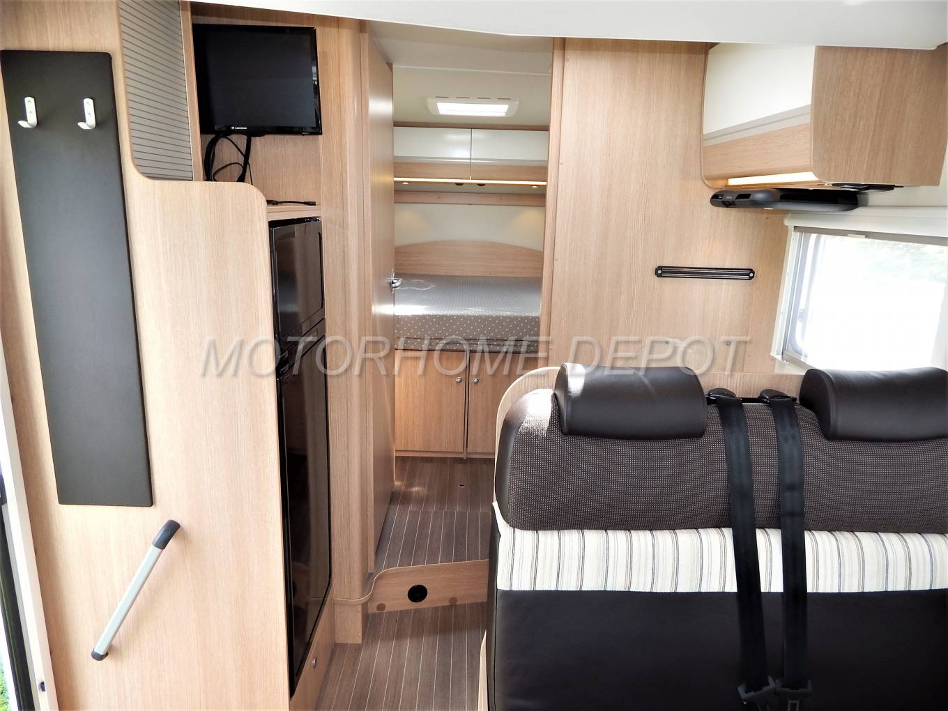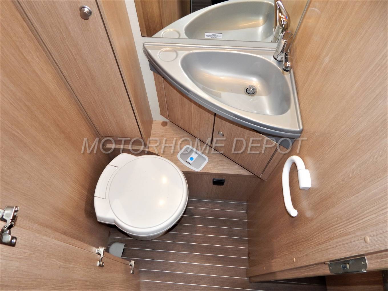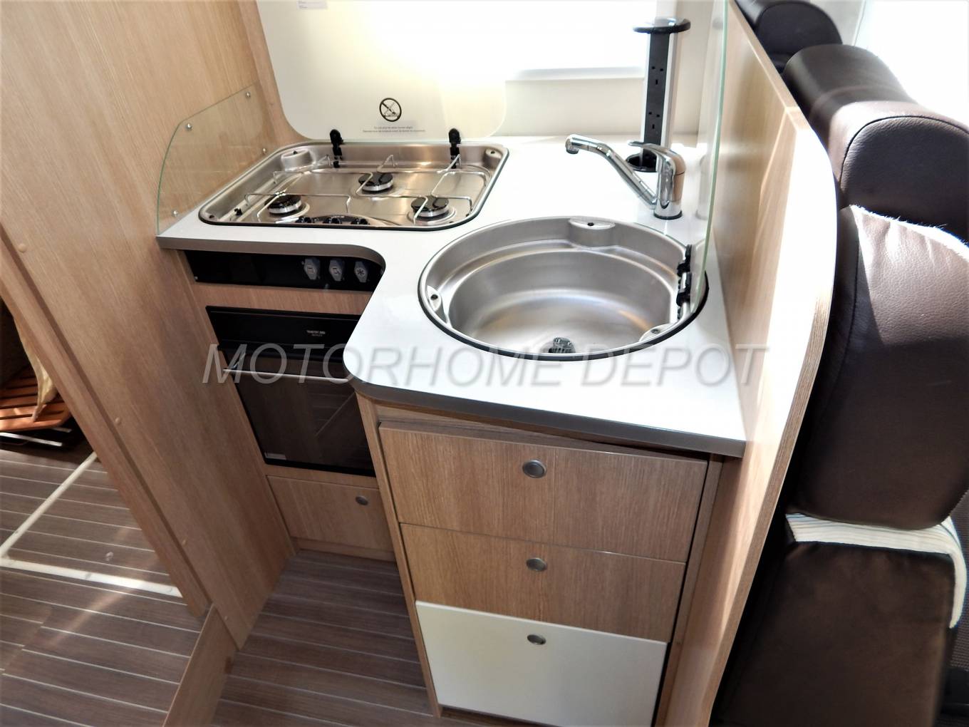 Moving rear is the L-shape kitchen with 3 burner gas hob with hinged glass covers, stainless steel sink, chrome mixer tap, Thetford oven, extractor fan, rooflight. Opposite a large 3 way Fridge with separate freezer compartment that can be powered by:240v;12v or gas depending whether you are lugged in on site or wild camping. There is plenty of drawer and cupboard space for all your holiday provisions. A tower power point can be raised from the work surface for electrical equipment.