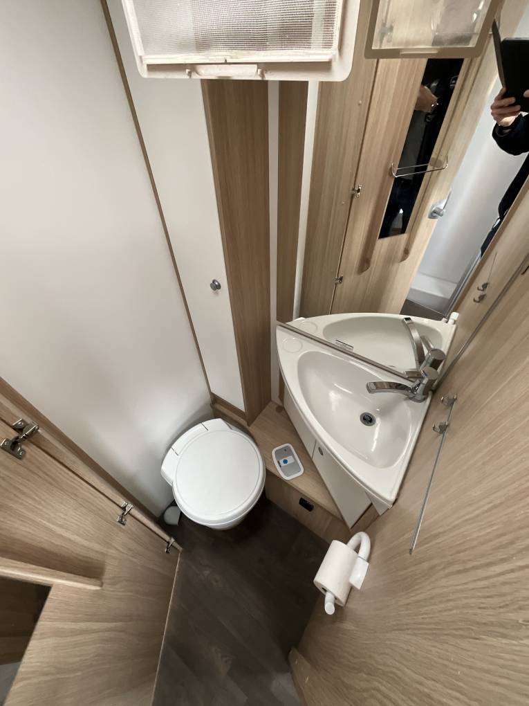 The washroom comes fully equipped with a large vanity unit, wash basin and toilet with cassette.