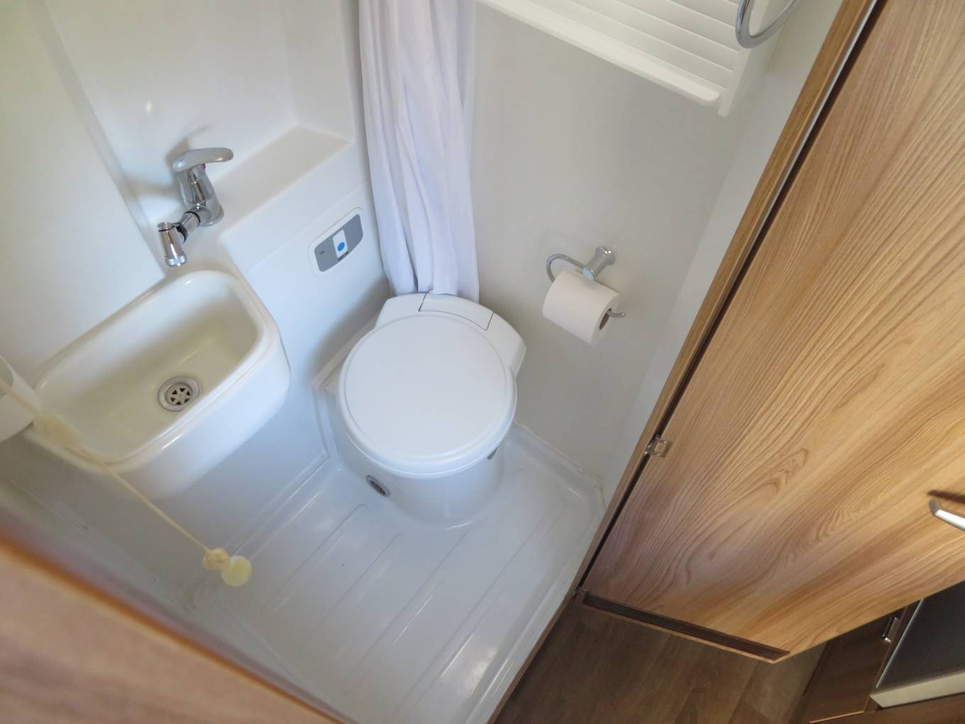 The midships kitchen is well equipped with three way fridge, two burner hob,grill,drawer and locker storage. There is still a good range of worktop and table space, having a kitchen extension panel and swivel table extension and adjacent to the kitchen is the immaculate washroom with shower, toilet and sink with extendable mixer tap.