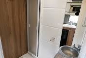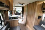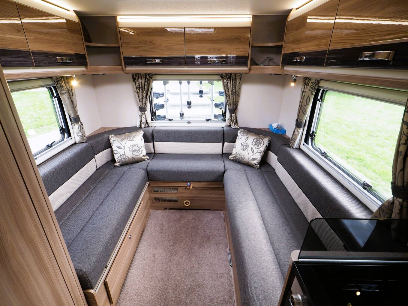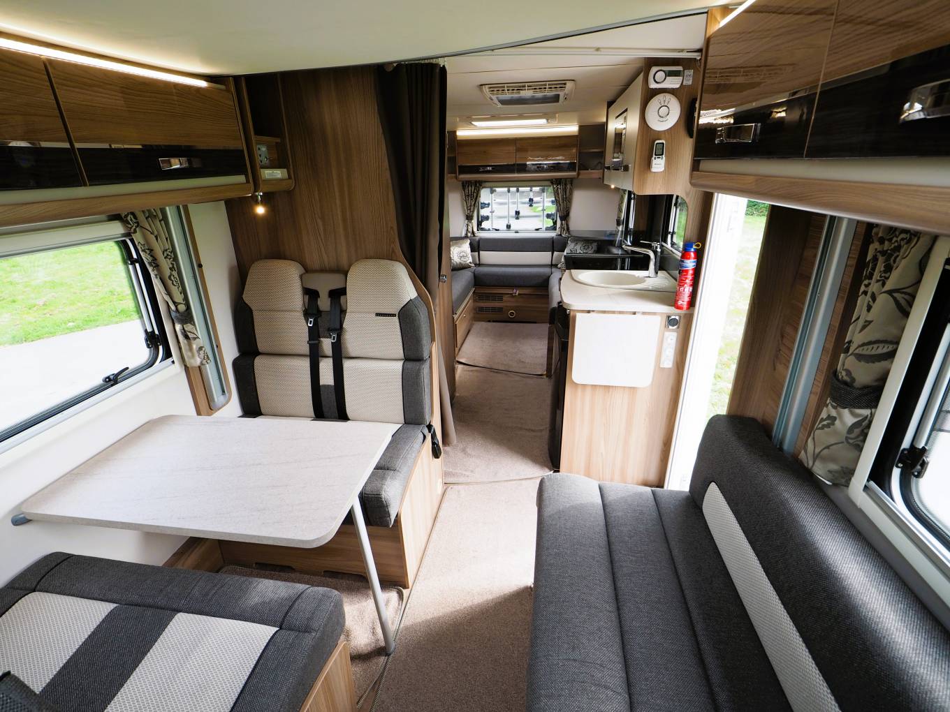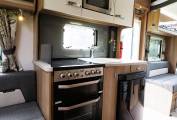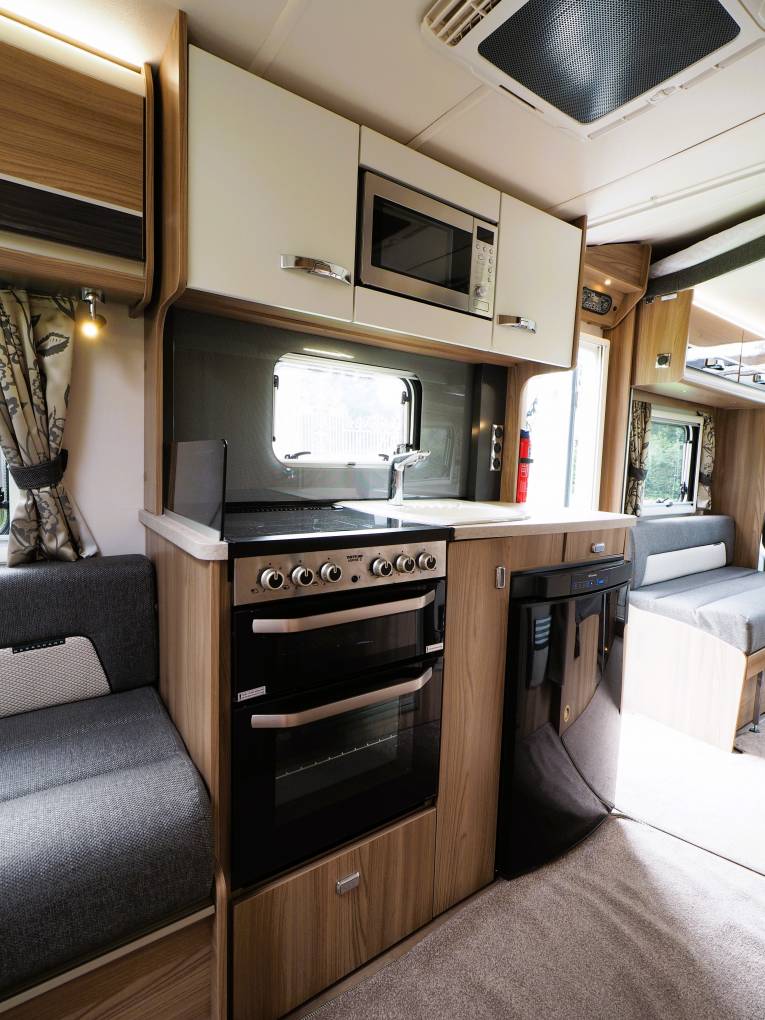 The accommodation includes a large U-Shaped rear lounge with TV shelf and occasional table, a separate lounge/dinette up front, central kitchen and fully equipped washroom. The kitchen will satisfy the most keen of cooks with all you need to rustle up anything from simple snacks to a full blown Sunday Roast. Comprising an oven and separate grill with duel fuel hob above, microwave oven, sink with running hot and cold water and a three way fridge with freezer box with storage drawers, cupboard and overhead lockers. The washroom with flushing cassette toilet, sink and overhead shower provides home from home comforts.
