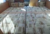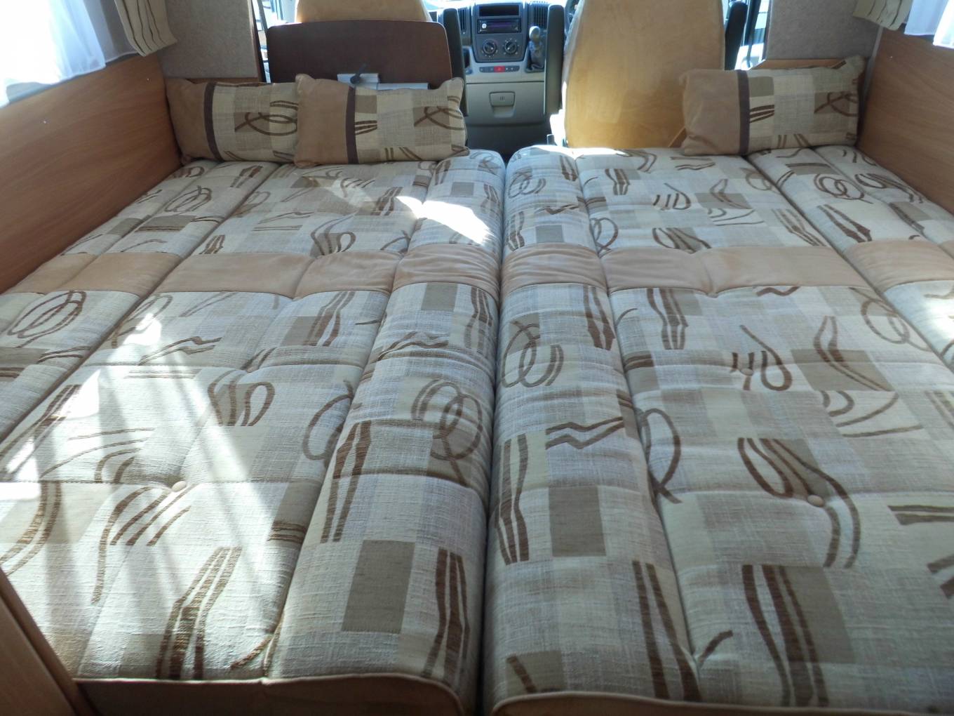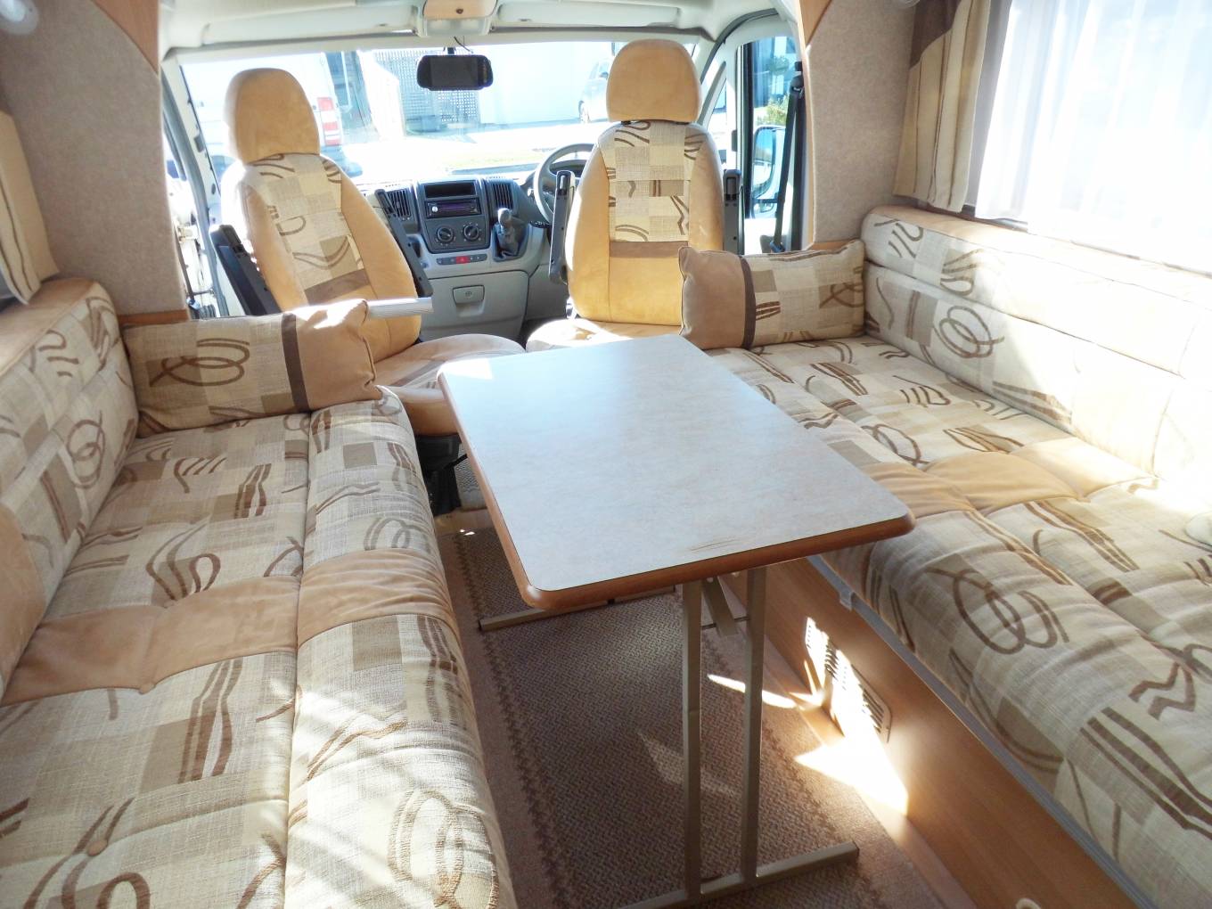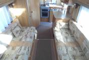 The lounge consists of 2 large side facing sofas measuring 6'0" x 2'4" which give you the option of using them as 2 single beds if you are 6 feet tall or under. Pull the two sofas across and you have a huge double measuring 6'11" x 6'0" to comfortably fit even the tallest of people. The windows are fitted with fly screens and blinds and there is plenty of storage space courtesy of the overhead lockers. Behind the front passenger chair is a small drinks table on an adjustable stand and for meal times simply erect the freestanding dining table and then when you have finished store it away in a cupboard to free up your lounge space again.