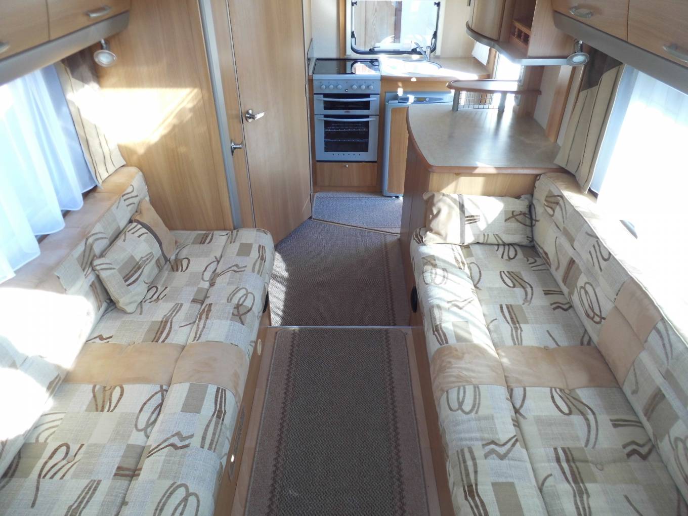 The bathroom has a shower cubicle, a lower cupboard with a built-in wash basin, an overhead storage locker, a Thetford swivel cassette toilet with electric flush and a skylight. At the rear is the end kitchen which has impressive specification including a microwave, a dual-fuel hob with 1 electric hotplate and 3 gas burners, a 3 way fridge freezer, an oven and grill and a stainless steel sink with mixer tap so you have all the facilities at hand to conjure up a gastronomic delight each day.