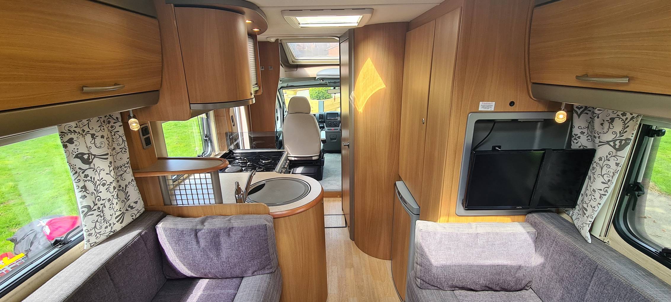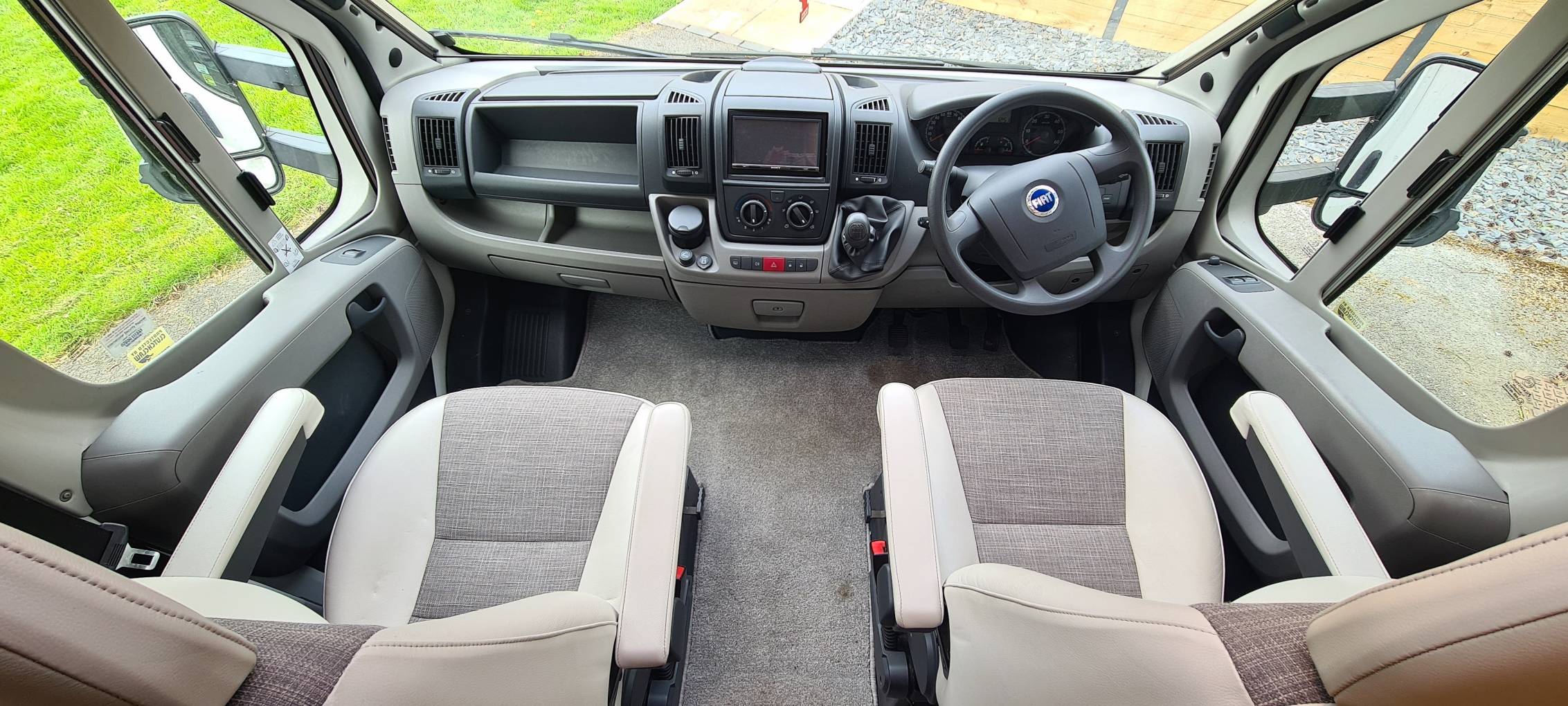 The motorhome has twin swivelling captains seats to the cab