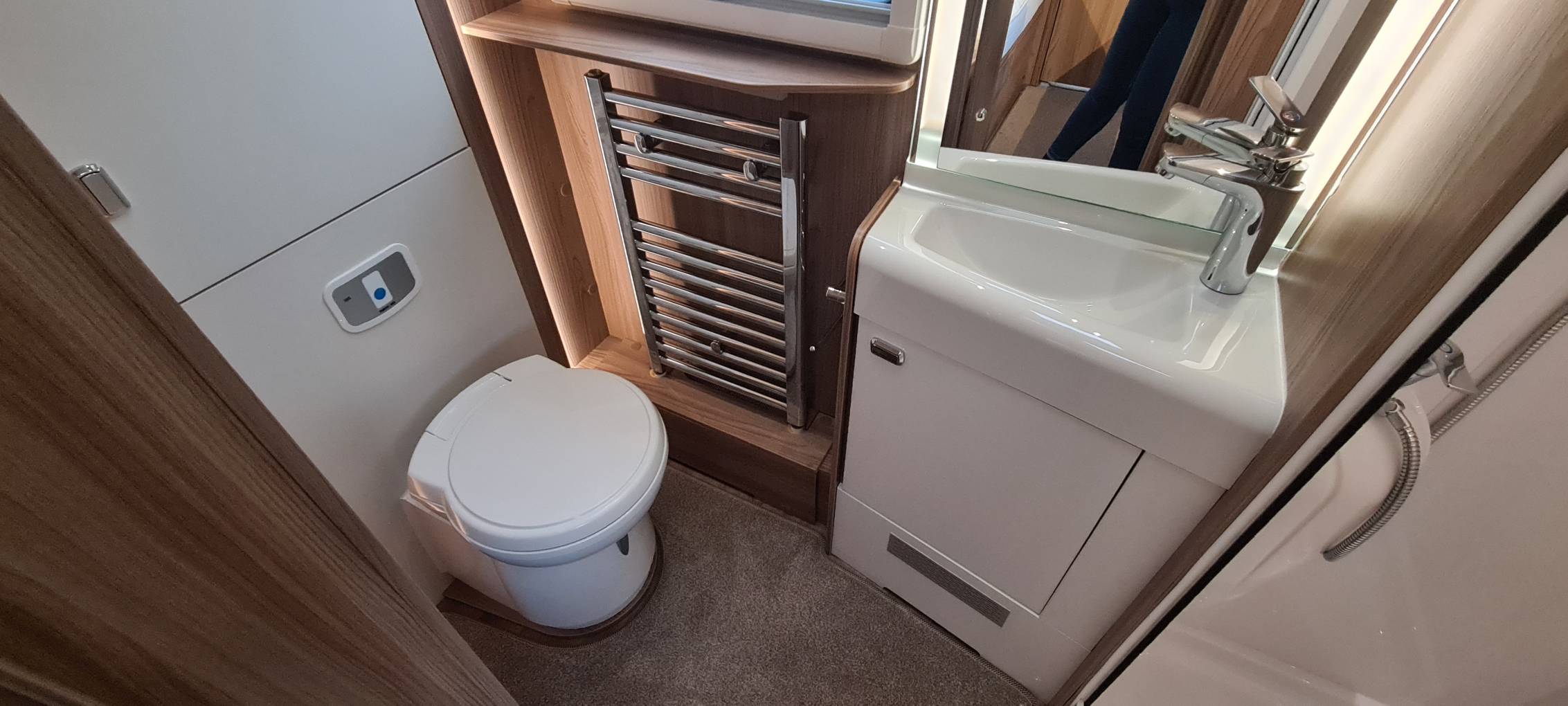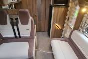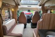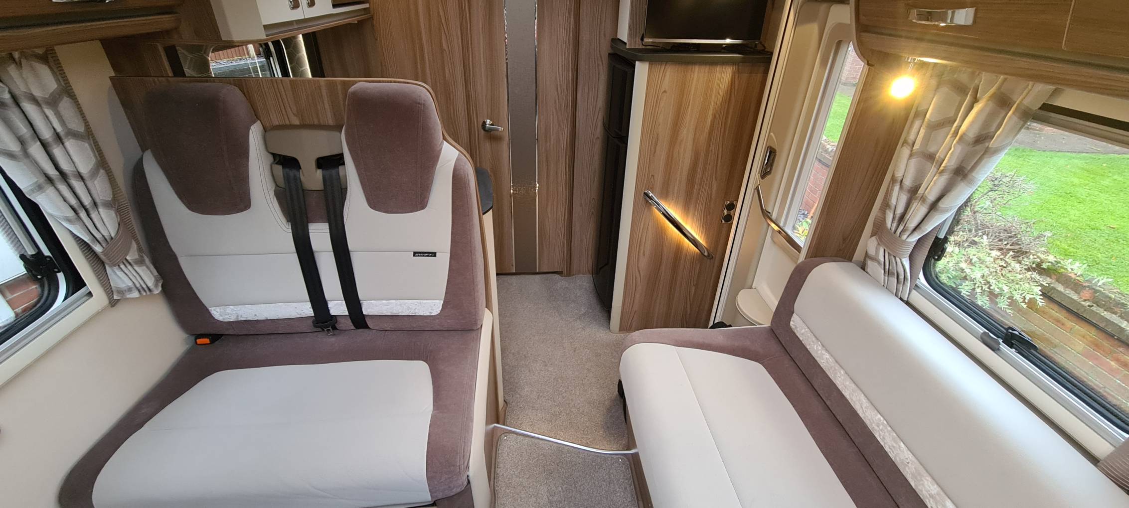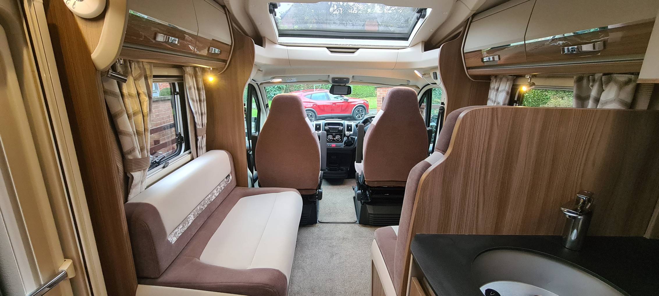 Step inside and you will be greeted with a spacious and bright centre dinette, thanks to the large sunroof there is plenty of natural light in the motorhome. The seating area has two forward facing seats, with seat belts and one side facing bench, the captain chairs turn to create the hub of the motorhome. The table can be remove and stored in the space tucked away in a cupboard space in the washroom and this space then creates the first sleeping area in form of a double bed.
