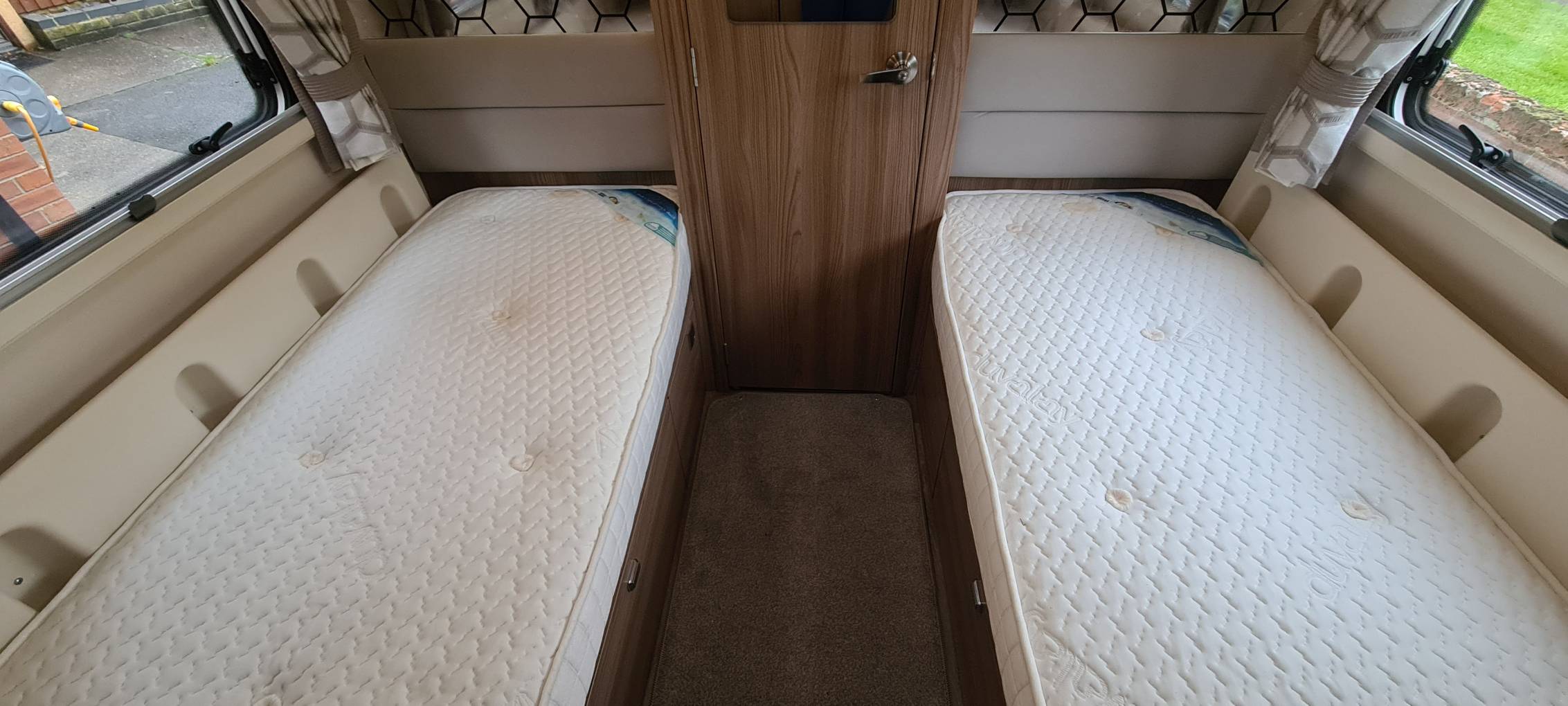 Step through the door into the back of the van and you will walk into the bedroom space, there are two single beds with wardrobe space above and access to the external lockers from underneath the bed. There is a second TV aerial access point in this room so adding a TV to this room would be possible.