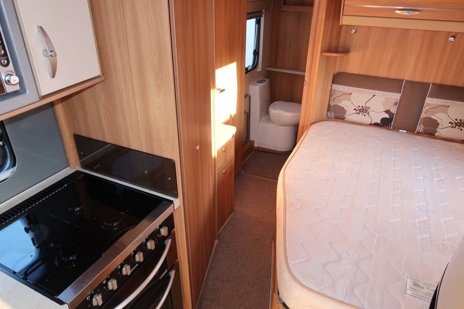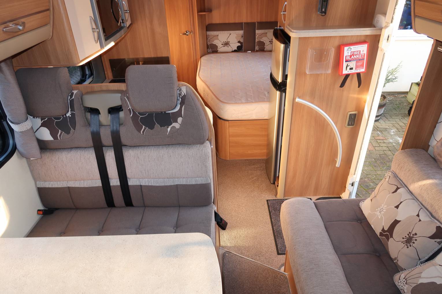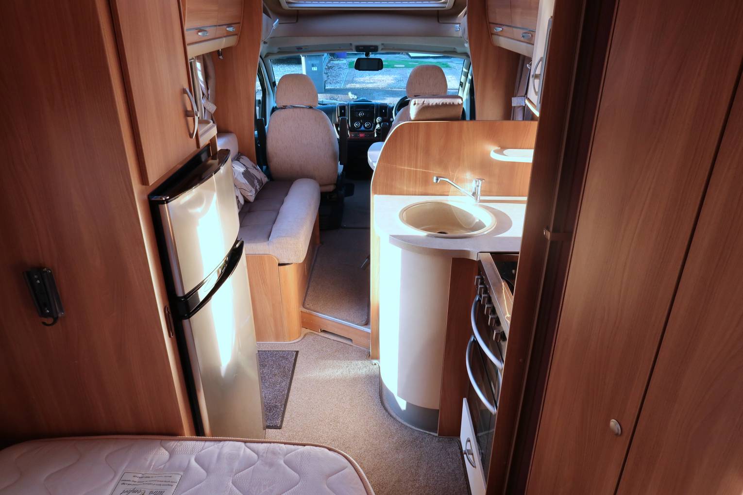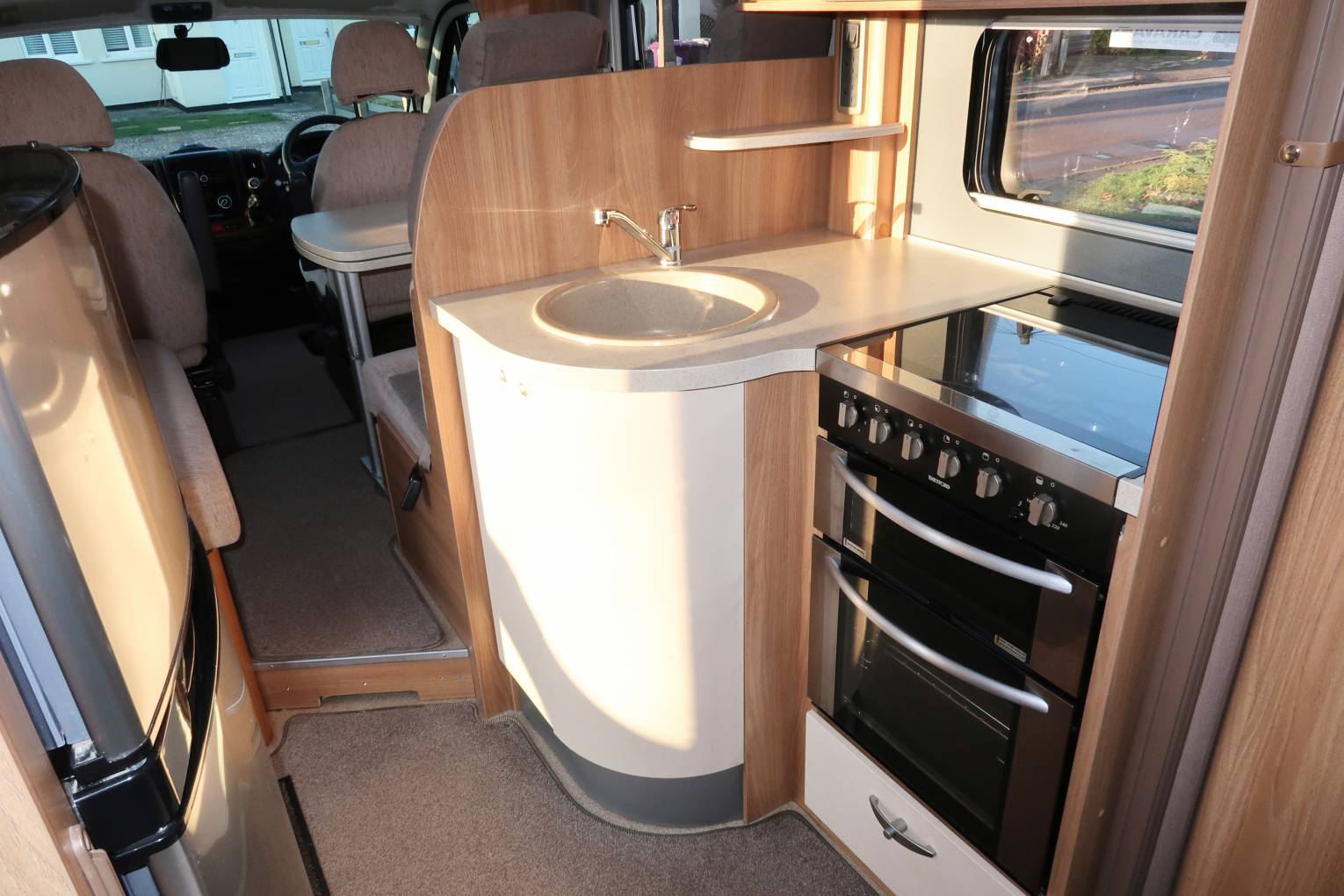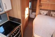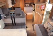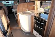 As you move forwards you come to the mid-kitchen which is well equipped for any budding chef to rustle up a gastronomic meal. There is a dual-fuel hob with 1 electric hot plate and 3 gas burners, a gas oven and grill and a Sanyo microwave, so in terms of cooking you have all bases covered. There is also a ceramic sink with a mixer tap and a reasonable amount of worktop space for food preparation. Opposite you have a large Thetford fridge freezer which runs off all 3 power sources.
