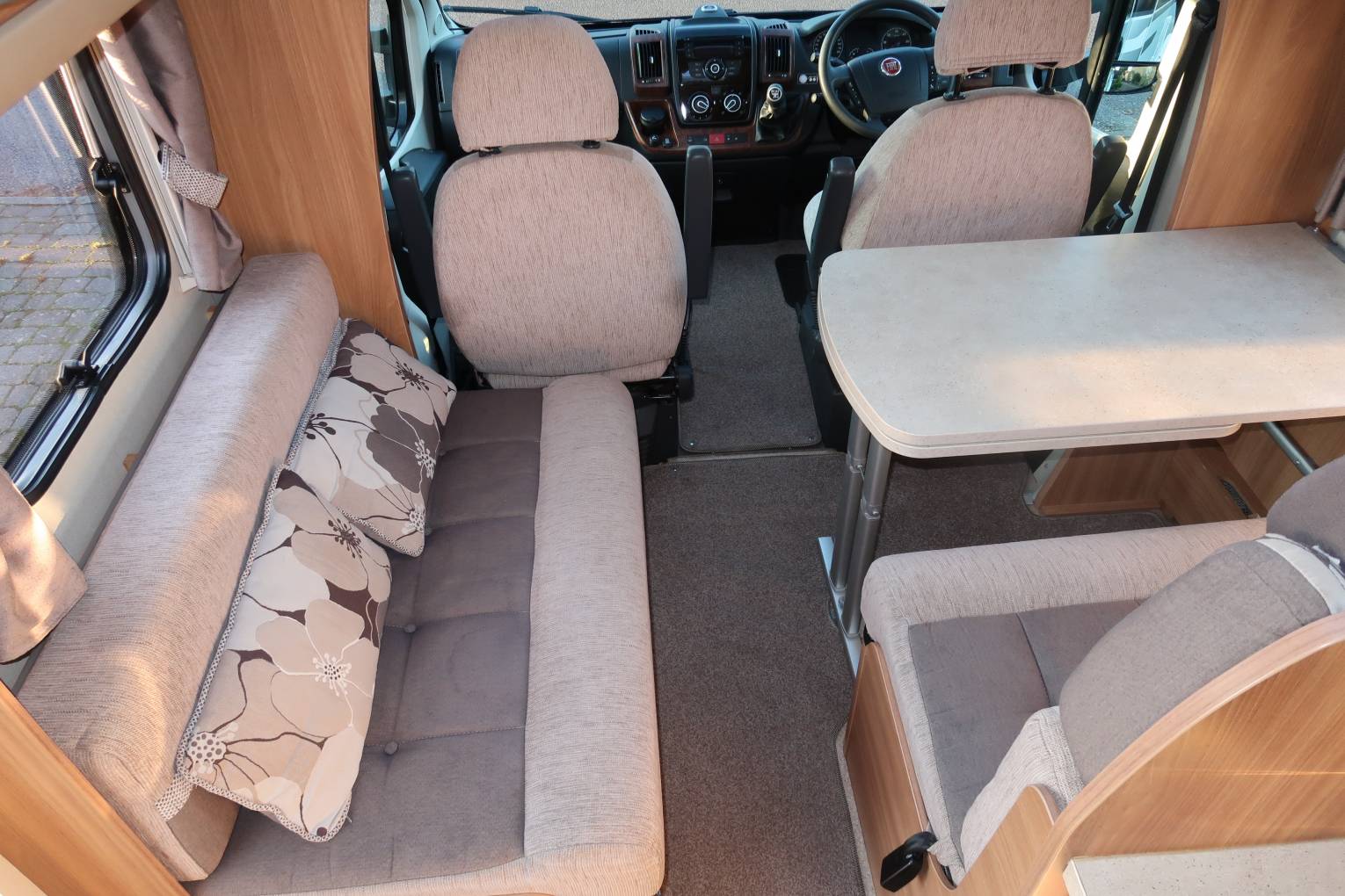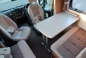 The lounge dinette which is situated towards the front of the vehicle is a lovely place to relax after a day out. There is a side facing sofa on the nearside and on the off side there is a two seater forward facing sofa which is fitted with two seat belts. The sturdy dining table fixes onto a side rail and this can be extended right across the vehicle. When not required it can be removed and stored away to give passengers more legroom. Two large roof lights over the lounge and driver's cab ensure that this area is flooded with lots of natural light making it a lovely spot to unwind and enjoy a few drinks. In the cab the driver has air conditioning, power windows and mirrors, steering wheel mounted controls, driver and passenger airbags, a radio CD player and more.