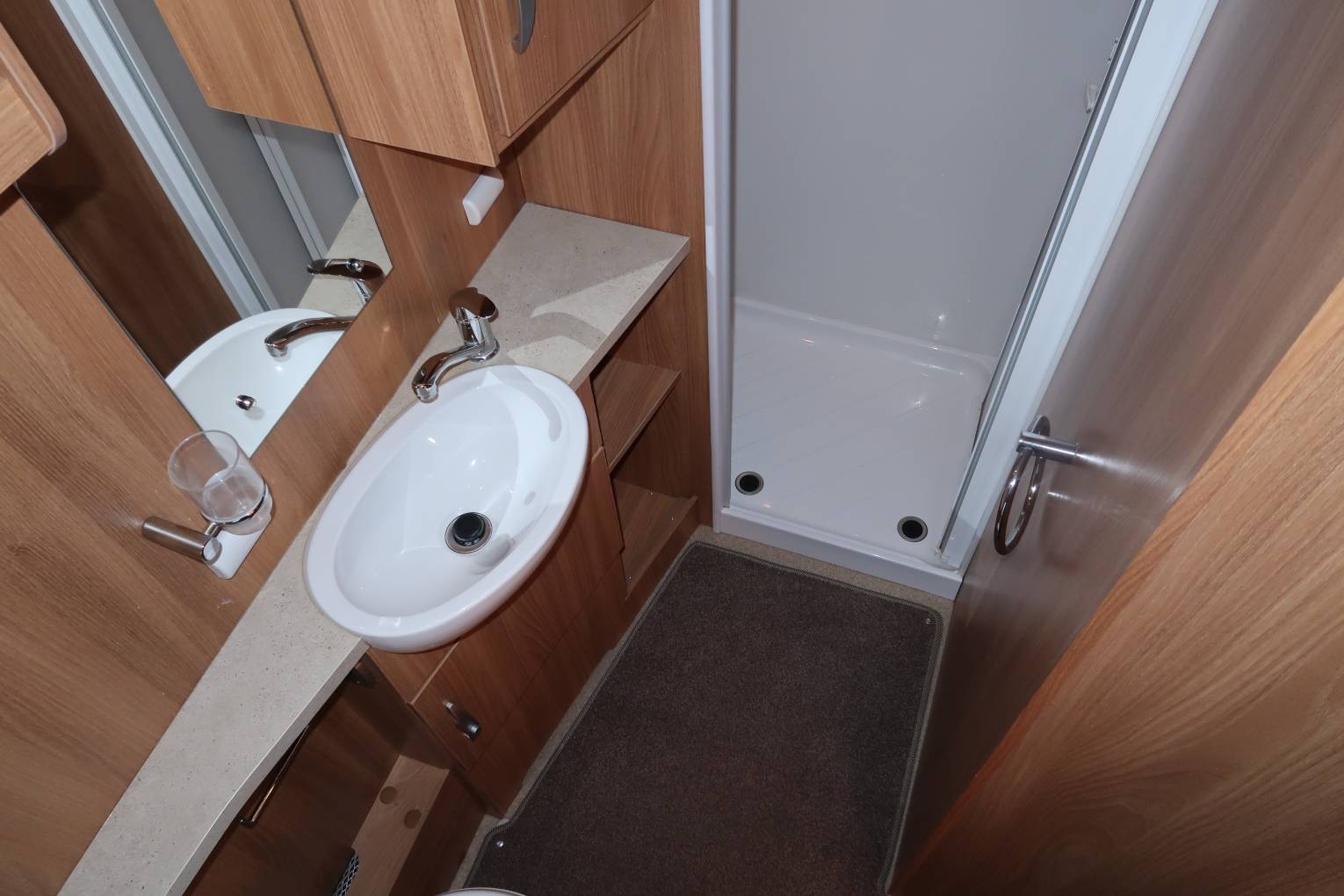 The internal layout comprises of a spacious end washroom with a large separate shower. There is a cassette toilet with electric flush, a wash basin with a mixer tap and unusually for a motorhome washroom a surprisingly large amount of storage space for your toiletries. A window at the far end throws in lots of light which is always useful when you are getting yourself ready to go out. Also at the rear you have a fixed French bed which measures 1.88m x 1.33 m. The bed can be easily raised as it is on power struts and underneath is a substantial amount of storage space. There is additional storage in the overhead lockers surrounding the bedroom.
