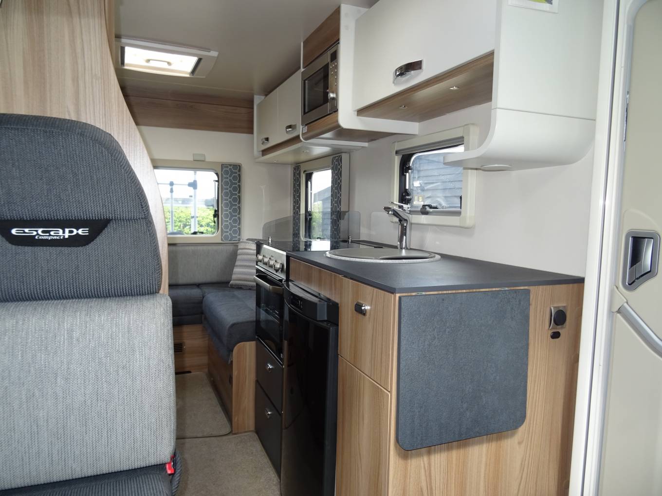 This lovely example of the Swift Escape C402 Compact 2 berth with only 4992 miles. New habitation check was in April 2023 and MOT 25/07/2024. This well laid out compact motorhome at only 5.99m in length and weight 3.300kg. As you enter through the side door to the right you have the central side kitchen area that has all you need, 3 gas rings, sink with good worktop space, high level microwave, fridge with freezer compartment, oven /grill, and plenty of storage. Moving to the back there is a good size u shaped lounge seating area to relax in that makes easily into a double bed. Moving round is the well equipped washroom with shower, sink and unit with mirror. moving to the front you have dining area with two forwad facing seats with belts. Both front seats swivel round making this a good area to dine or relax in with a wall mounted television. Other great features cab air con, cruise control, TV with DVD, large wind out awning, blinds. solar panel, removable carpets, vango kela V air drive away awning, rainbow screen cover.