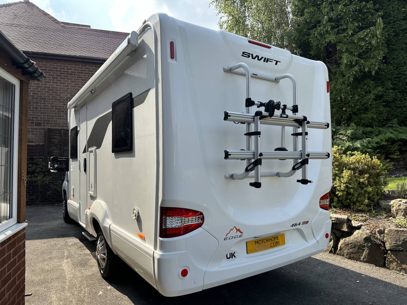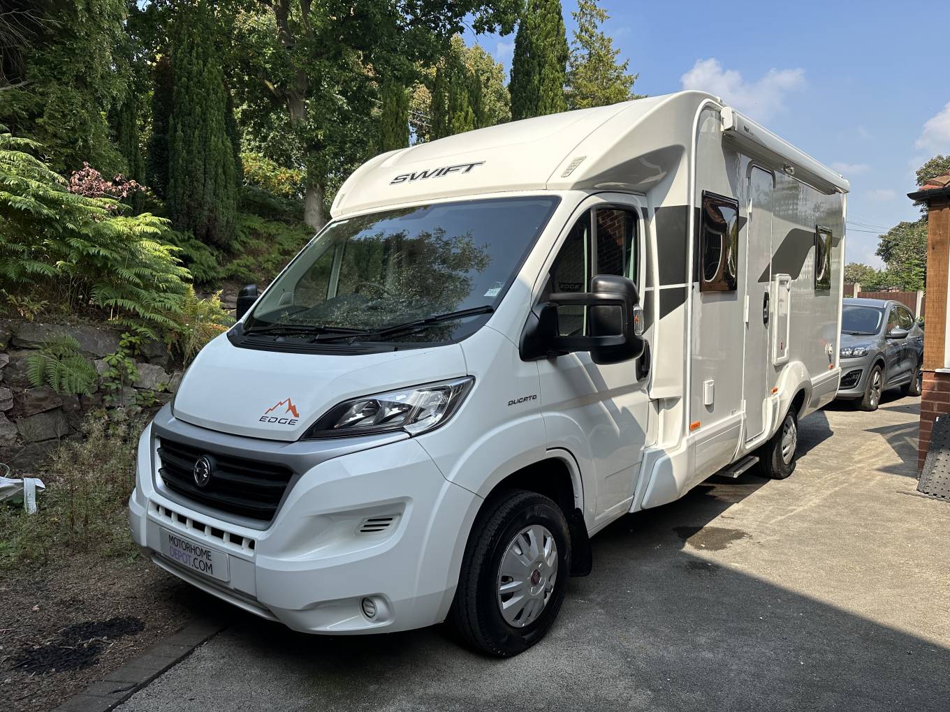 Motorhome Depot Retail are pleased to present this excellent example of a Swift Edge 464 four berth motorhome with just 1 owner from new. You will find a fixed French bed to the rear, which can be closed off from the rest of the motorhome to provide privacy, the opposite side of the van you will find the large washroom, which includes a electric flush toilet, wash basin with storage, mirror and shower with a curtain to separate.The kitchen is complete with a 3-way fridge, 3 gas burner hob, oven and grill, microwave and sink with draining area and preparation space.