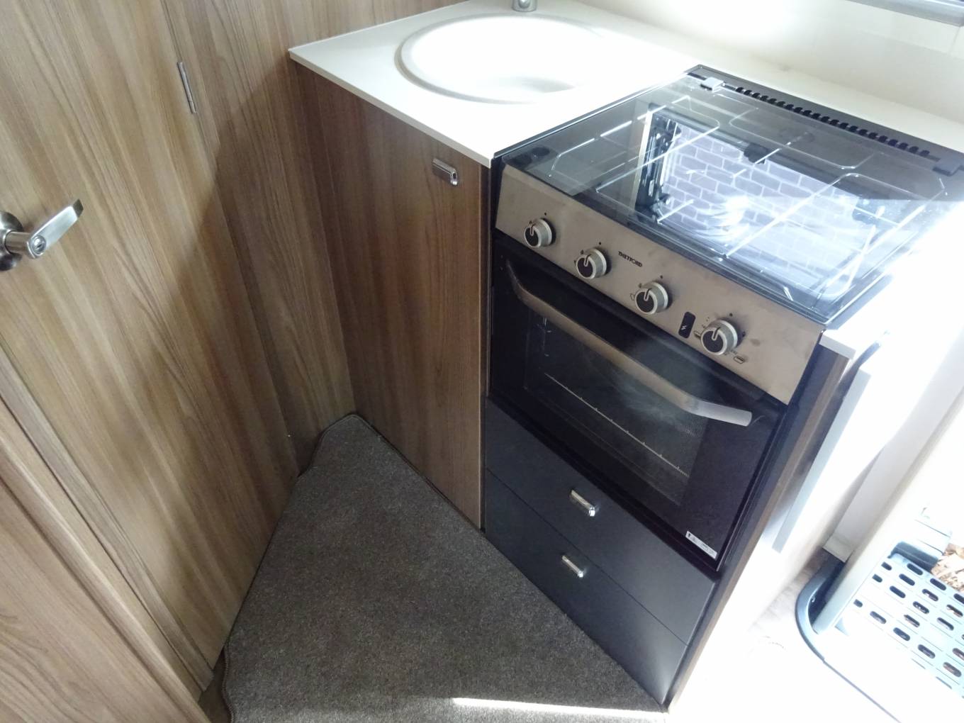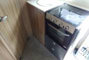 At the rear of the lounge is a very impressive kitchen, given the 604’s overall dimensions. Thetford provides the main cooking facilities – a three-ring hob plus oven/grill combination, complemented by a microwave. The sink has an add-on plastic drainer, while the fridge across the corridor has a useful 138-litre capacity. The space-efficient nature of the cooker means there’s good storage – a large, shelved undersink locker (where you’ll also find a cutlery drawer), single overhead locker with crockery racks, plus a large drawer and a floor locker. There’s also a useful flip-up worktop extension.