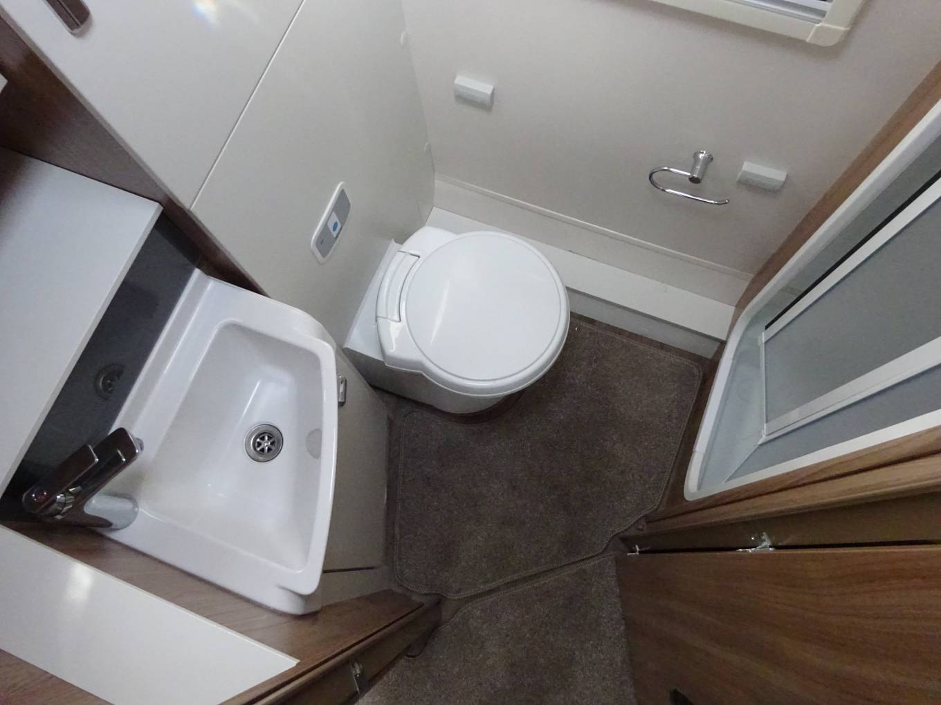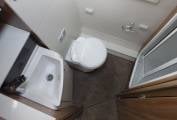 At the rear of the vehicle is an excellent washroom featuring a WC, Sink and vanity units The shower cubicle has a trigger-operated Ecocamel showerhead, which bodes well for water-saving, and other details range from a window and rooflight to open shelving around the basin and a towel rail, there's also a very large wardrobe.