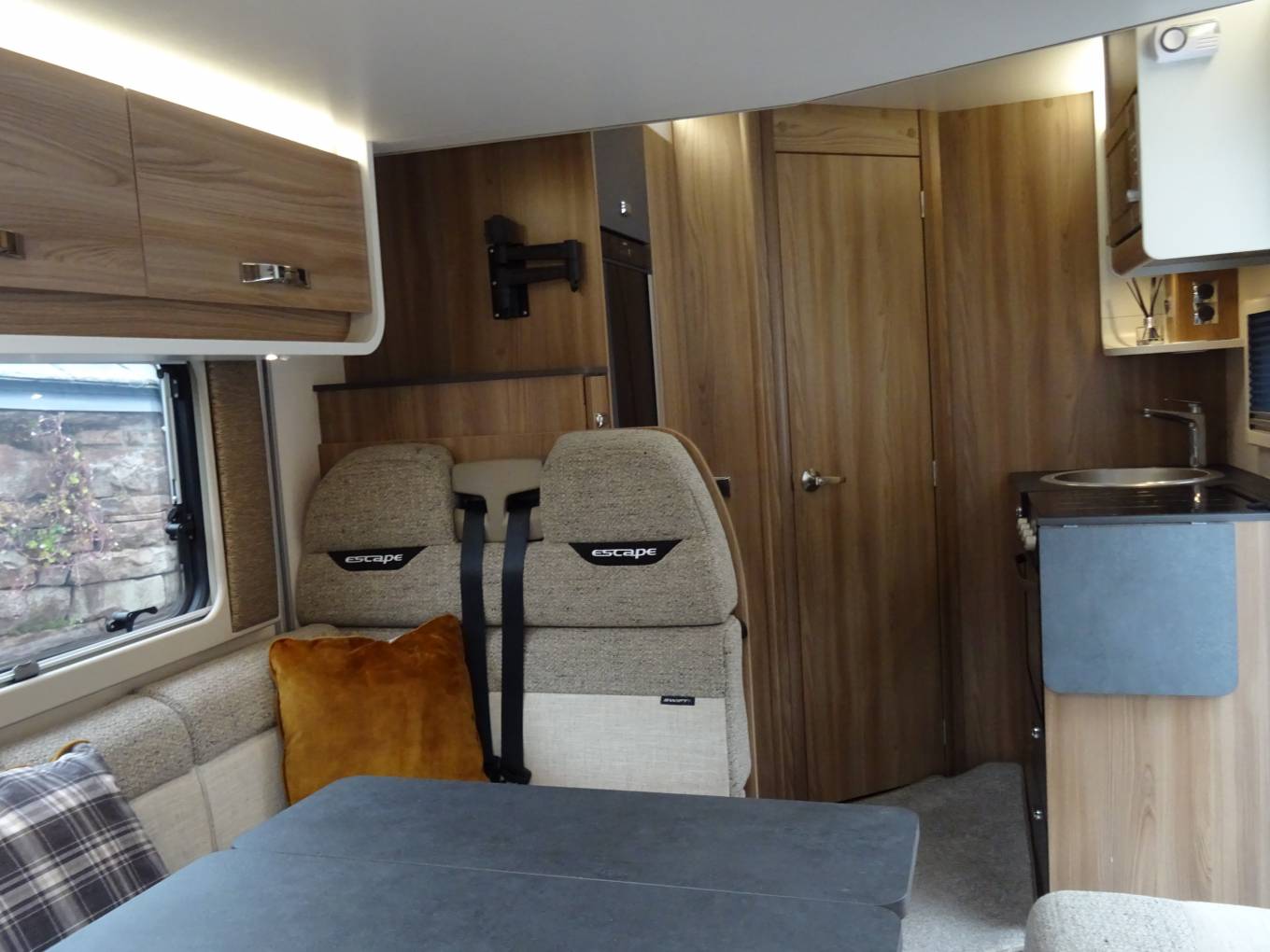 it's a great example of how much space can be created within the confines of a Motorhome with a sub-6m overall length. It's the manually-operated drop-down double bed over the lounge that enables this Escape to make the most of its interior space.