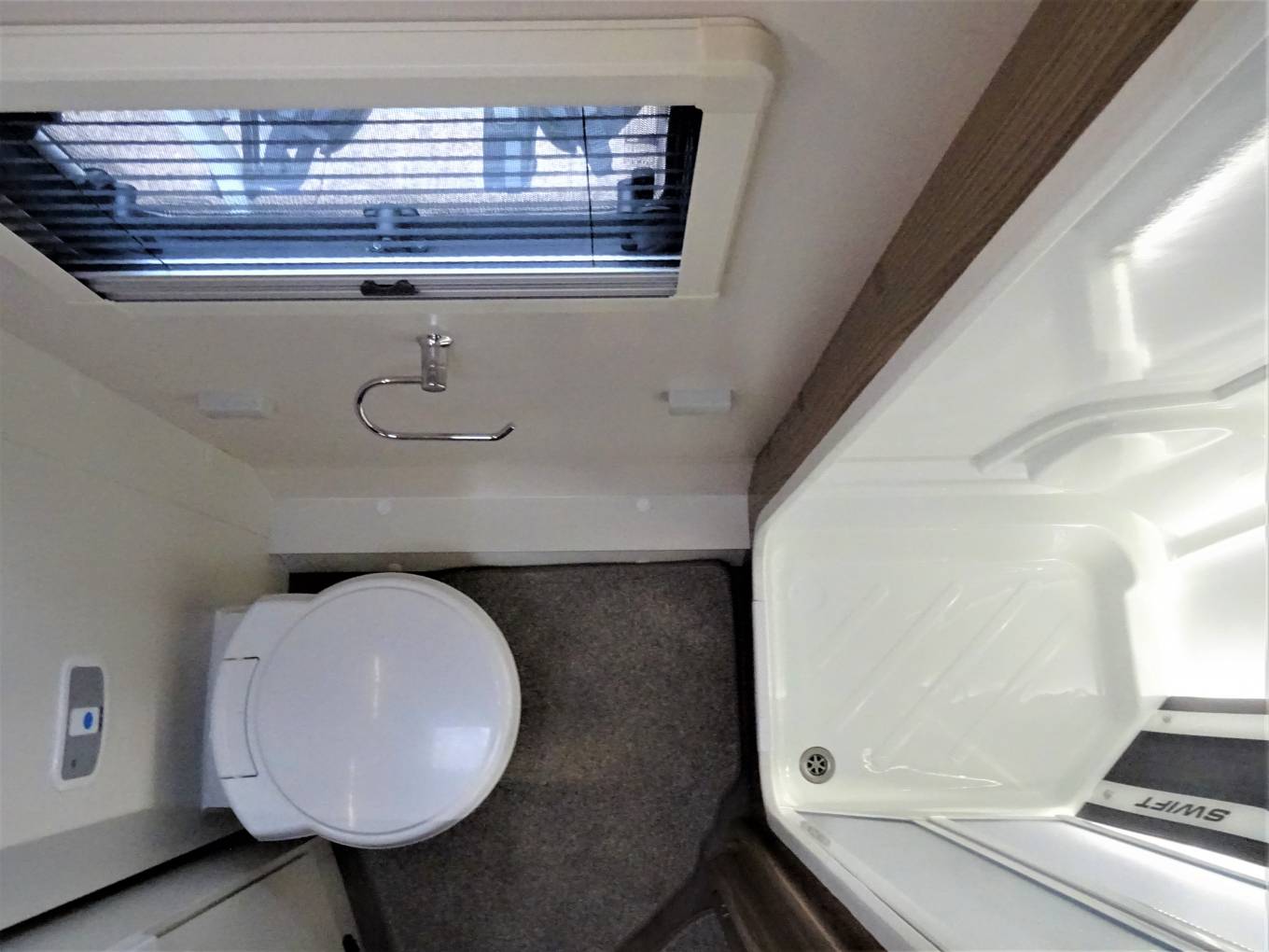 At the rear of the Motorhome is an excellent washroom featuring a WC, Sink and vanity units The shower cubicle has a trigger-operated Ecocamel showerhead, which bodes well for water-saving, and other details range from a window and rooflight to open shelving around the basin and a towel rail, there's also a large wardrobe.
