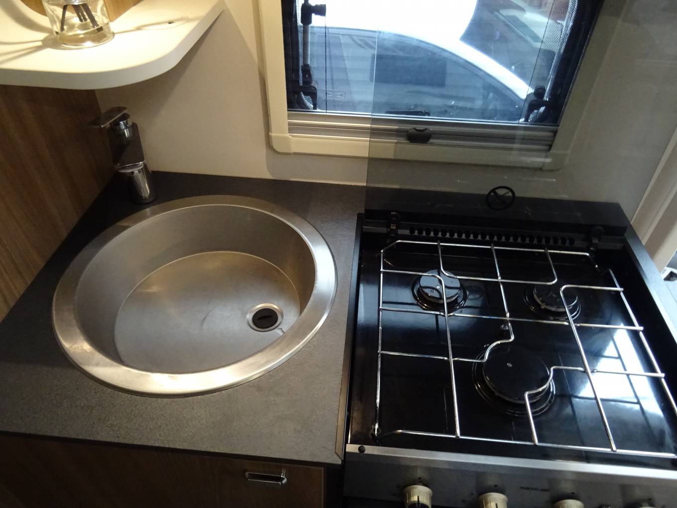 The Lounge is bright and comfortable and provides space for up to 6 Diners when utilising the swivelling Captain's Seats. At the rear of the lounge is a very impressive kitchen, given the 604's overall dimensions.