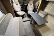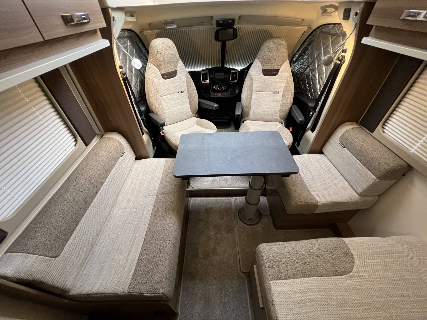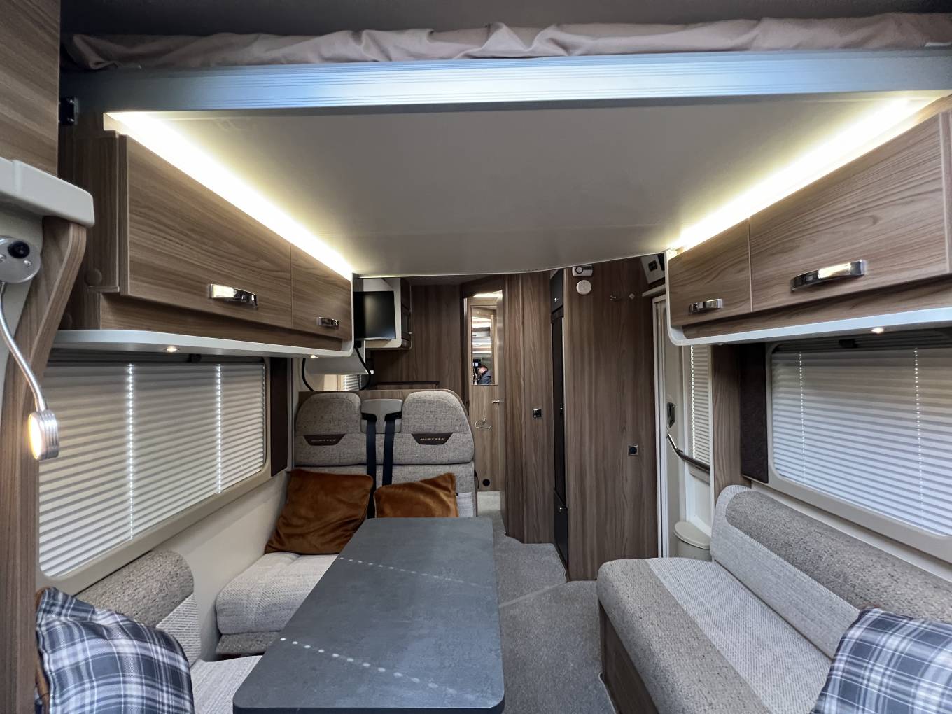 On entering via the Flyscreen protected Habitation door, to your left is the lounge area consisting of twin forward facing belted seats, a two seater settee on one side and a smaller one opposite, twin swivelling Cab Captains Chairs and a pedestal mounted table the is moveable in all directions.