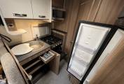 Here you will find a Three Burner Gas Hob, an Oven/Grill combination (which has never been used), a Microwave Oven, a Dometic three energy source Fridge, a Sink with a Hot and Cold mixer tap and a removable drainer plus plenty of cupboard and drawer space.