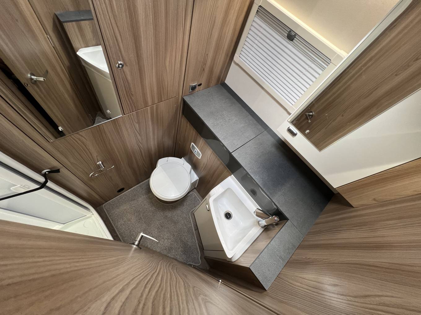 On through a door to the rear bathroom consisting of a Thetford electric flush Cassette Toilet, a Wash Handbasin, a separate shower cubicle plus an enormous wardrobe.