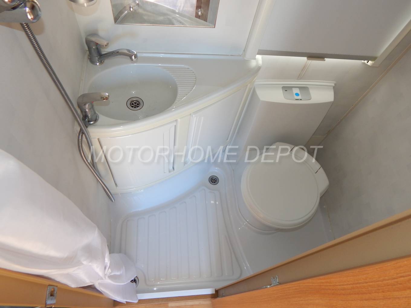 chrome mixer tap, mirror above and cabinet below. A Thetford cassette