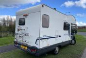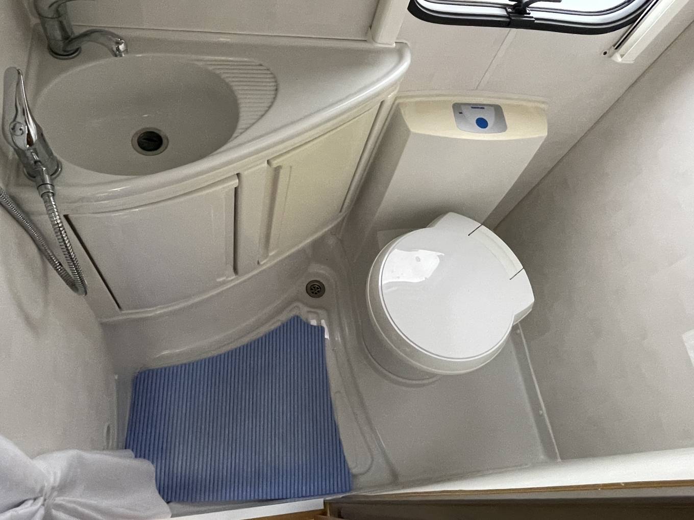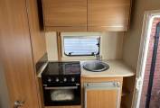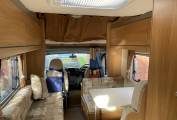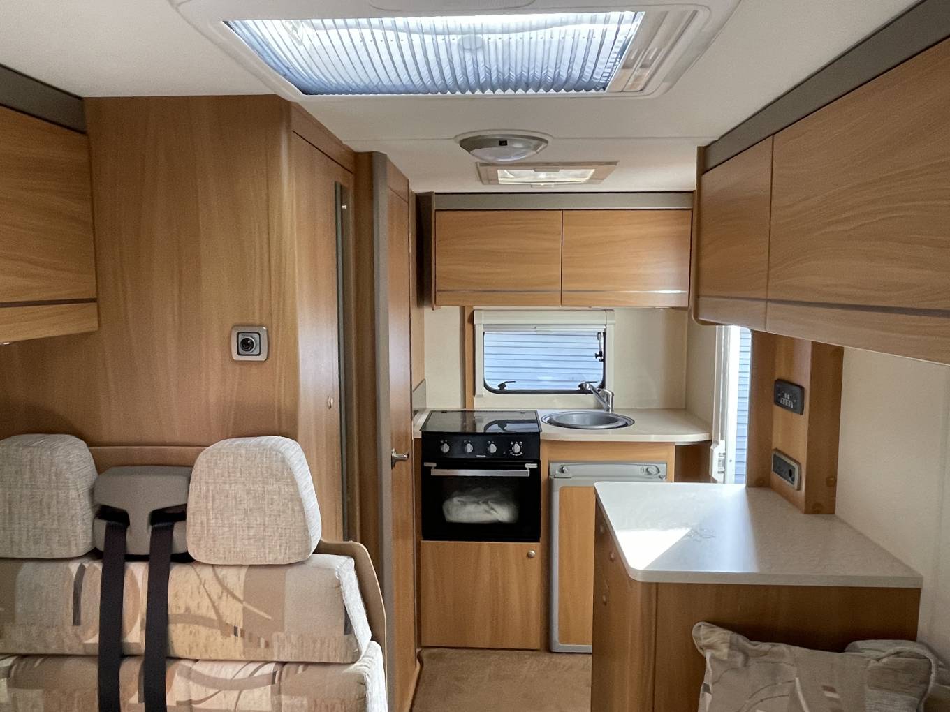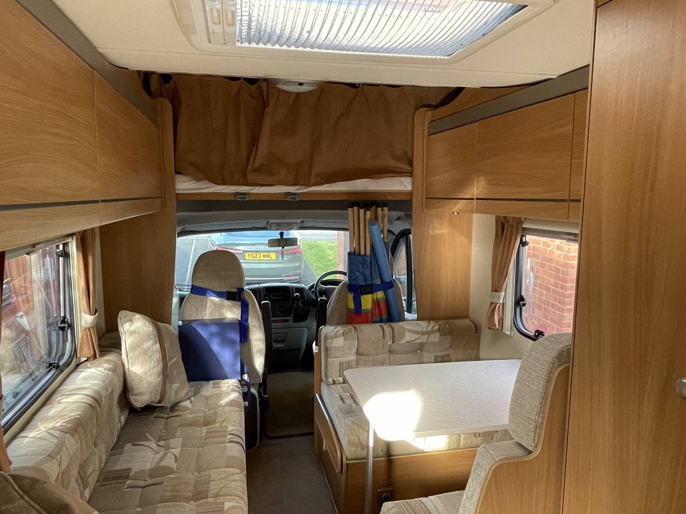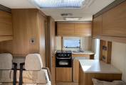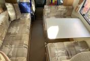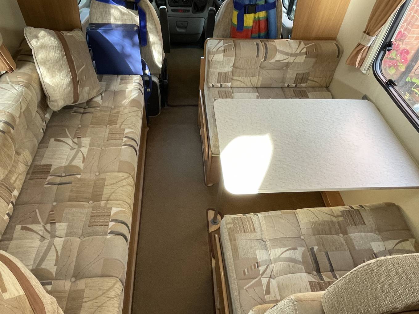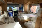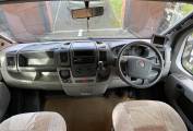 The front lounge is really bright & open and consists of a full double dinette with a large dining table, this area easily converts into a double bed, and there is also a large sofa opposite that can be used as a single bed at night. Additionally there is a large double bed over the cab . The rear kitchen benefits from a sink, 3-way fridge with freezer compartment, gas oven/grill and three-burner gas hob. The rear corner washroom has a Thetford electric flush cassette toilet, sink, central shower tray, rooflight with Flyscreen and storage cupboard & large mirror.