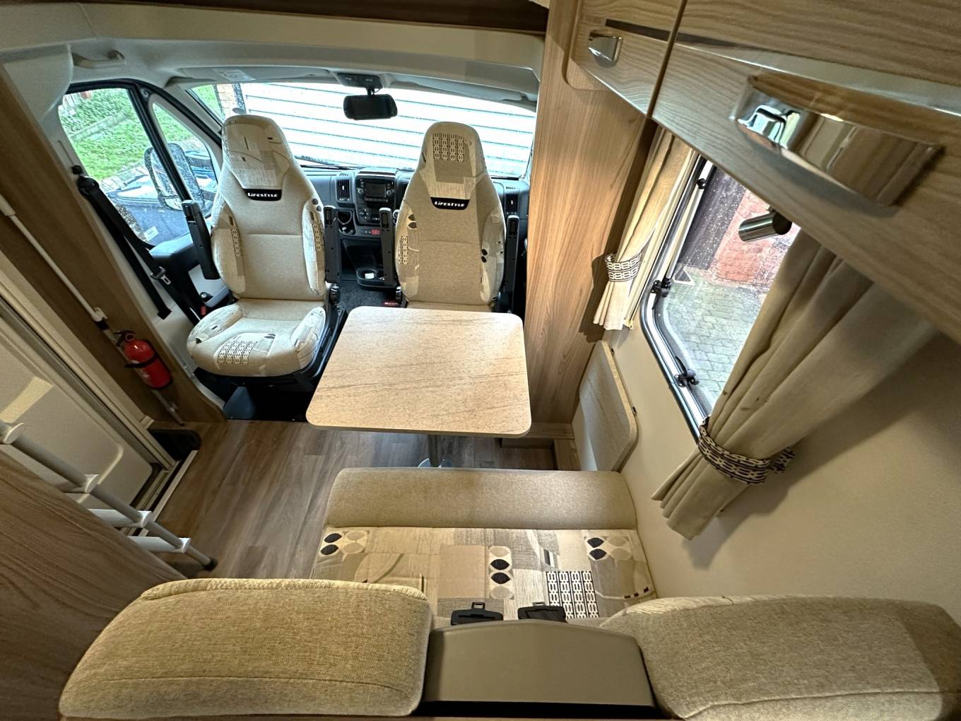 the dinette with two forward-facing seats with 3-point travelling seat belts, a small drop-down table and an option for the free-standing table, providing a second