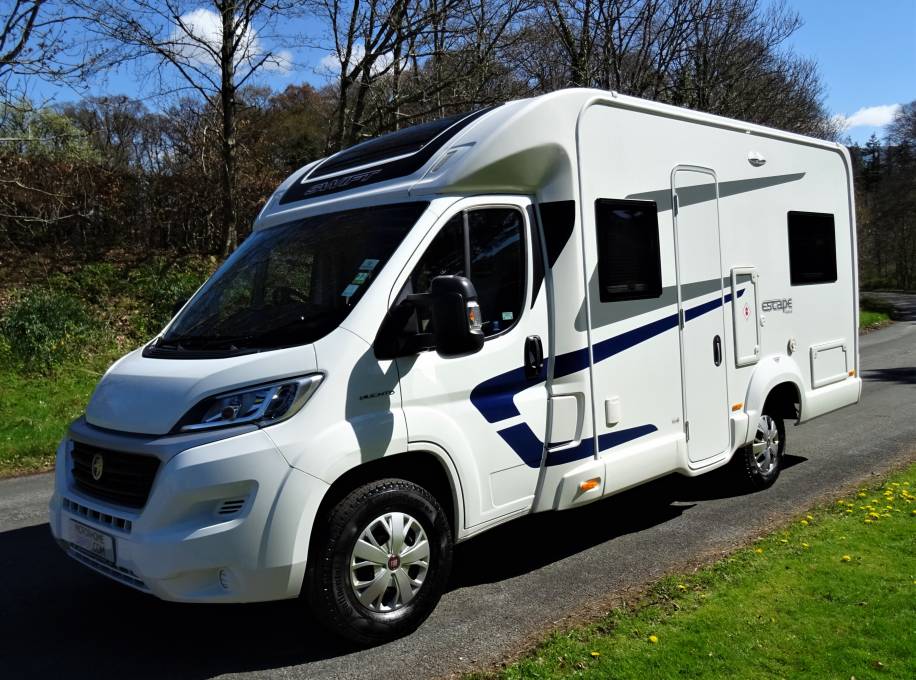 Four berth motorhome with four travelling belts and under 7 metres in length and can be driven on a standard drivers licence. Built on a Fiat Ducato chassis specifically designed for motorhomes to achieve a superior drive and fuel economy with a 2.3 litre diesel engine and six speed manual gear box. Inside the Escape 664 we have a rear fixed French bed that offers ample storage underneath. Adjacent is a spacious washroom with all essential fittings. The front of the 664 can seat up to 6 people around the dinette table with the use of the two captain chairs and is a great social space. Full kitchen facilities including microwave, gas hob, grill/oven. Fantastic condition throughout and has been well cared for by its owners and comes with extras that include a solar panel and Gaslow LPG refillable gas bottles.