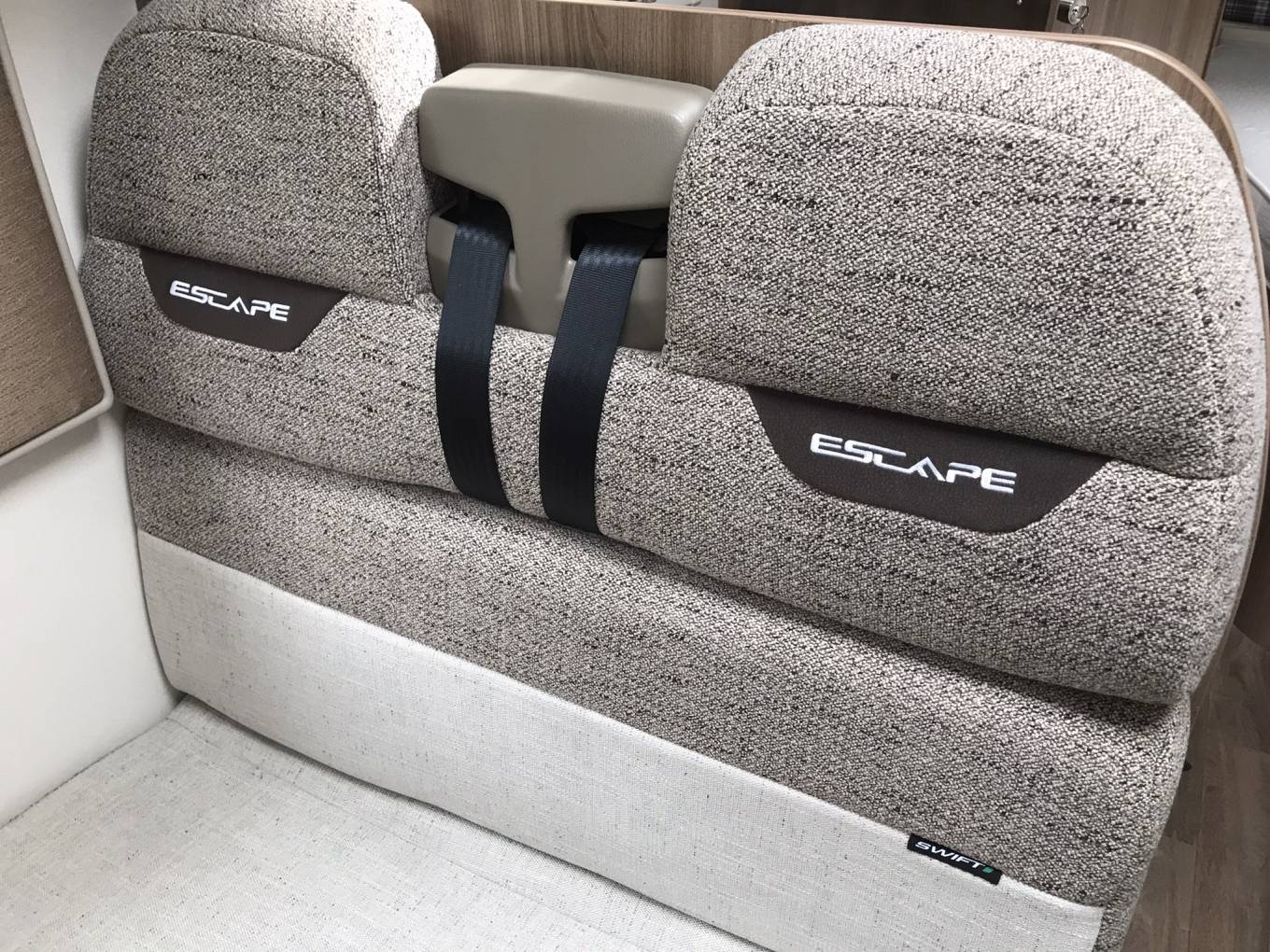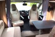Cab - 2 swivel seats, Remis blinds on the front screen, curtains, reverse camera and reversing sensors, cruise control, cab air conditioning and media unit with Bluetooth. The cab seats and dinette area are covered in a modern durable fabric.