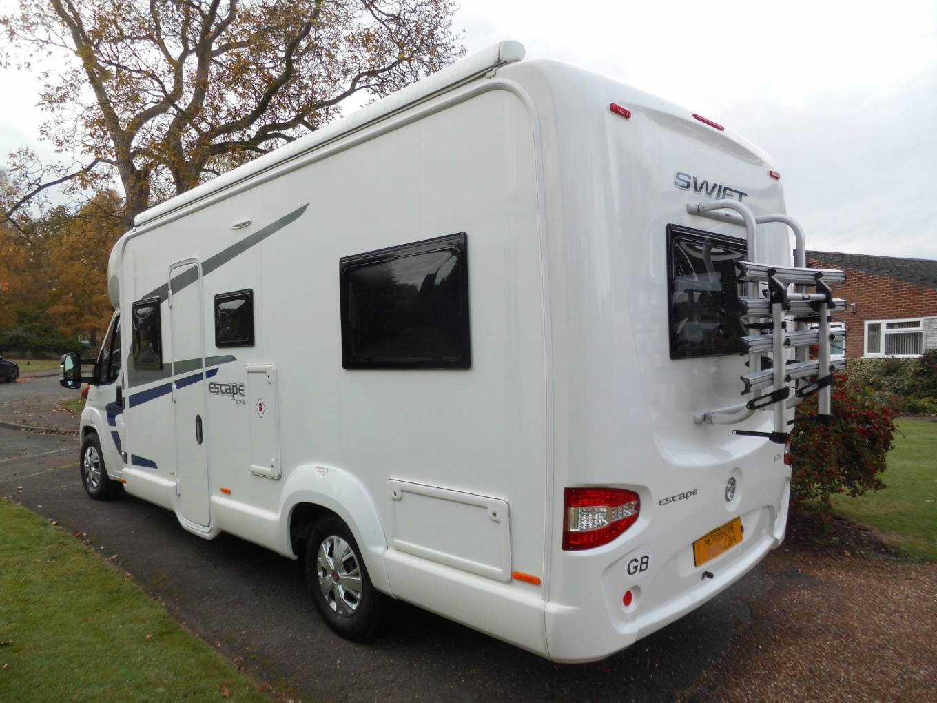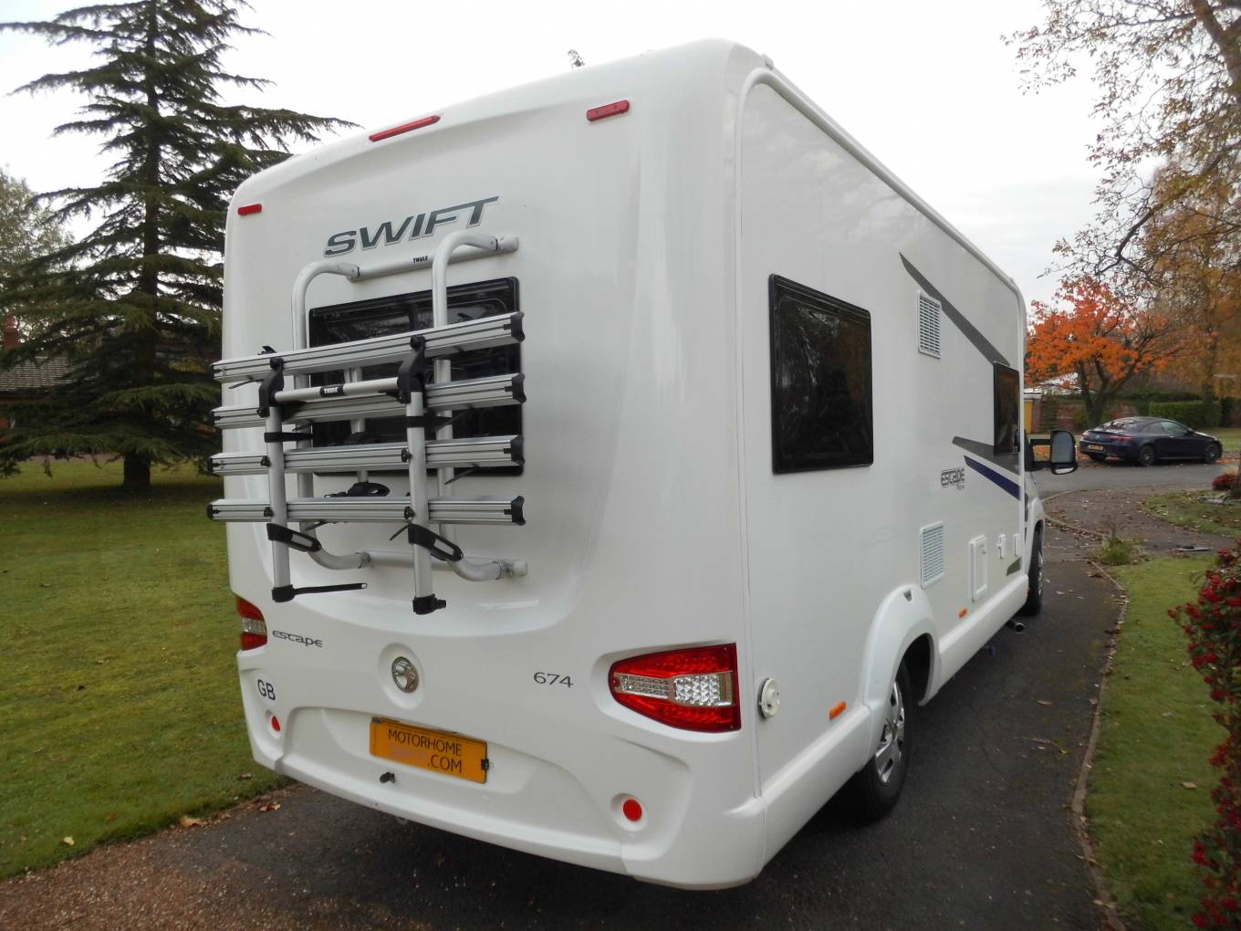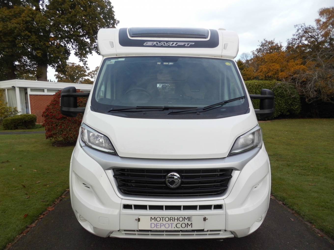 Swift Escape 674 6 berth This nearly new Motorhome with Automatic gearbox, 5 seat belts, Solar panel, 2 leisure batteries. Layout is front lounge dining area which converts to a double bed, centre washroom, central kitchen and rear U shape lounge which converts to a large double bed. Kitchen area has plenty of worktop space including an elevating leaf, sink, hob with 3x gas rings, oven grill, Microwave, a large fridge with freezer compartment, blow heating on gas or electric. There is a standalone dining table which can be used in either front or rear lounge areas. Washroom has Thetford cassette toilet, shower and a sink unit. TV aerial and TV points, LED lighting, window blinds throughout. Other features include swivel cab seats, cruise control, cab air con. Lots of internal and external storage space. Outside the motorhome has twin gas bottles, electric hook up, awning canopy and a bike rack that can hold 4 bikes. Base vehicle is Fiat Ducato 2287cc with automatic gearbox. First MOT due April 2020. This motorhome is covered by the manufacturers warranty until April 2020. Located in Norfolk. For more information, extensive photo file containing approximately one hundred pictures for an in depth virtual tour of the vehicle before you come to view, and to book a viewing, please call Simon or Maria on 01603 381972 or 07757 221350. VIEWING BY APPOINTMENT ONLY. Free 14 day drive away insurance is available with this vehicle. We welcome buyers from across the UK and Europe, low cost delivery is available.