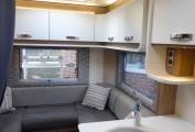 U Shaped Lounge with removable dining table. Ultra-low energy lighting system, LED spotlights, Over-locker LED ambient lighting, converts into one large double bed.g scheme with Scatter cushions, ‘Aralie Sen’ woodgrain with contemporary colouring, Matt white overhead lockers, Chrome handles with push-button locks on overhead locker doors.