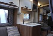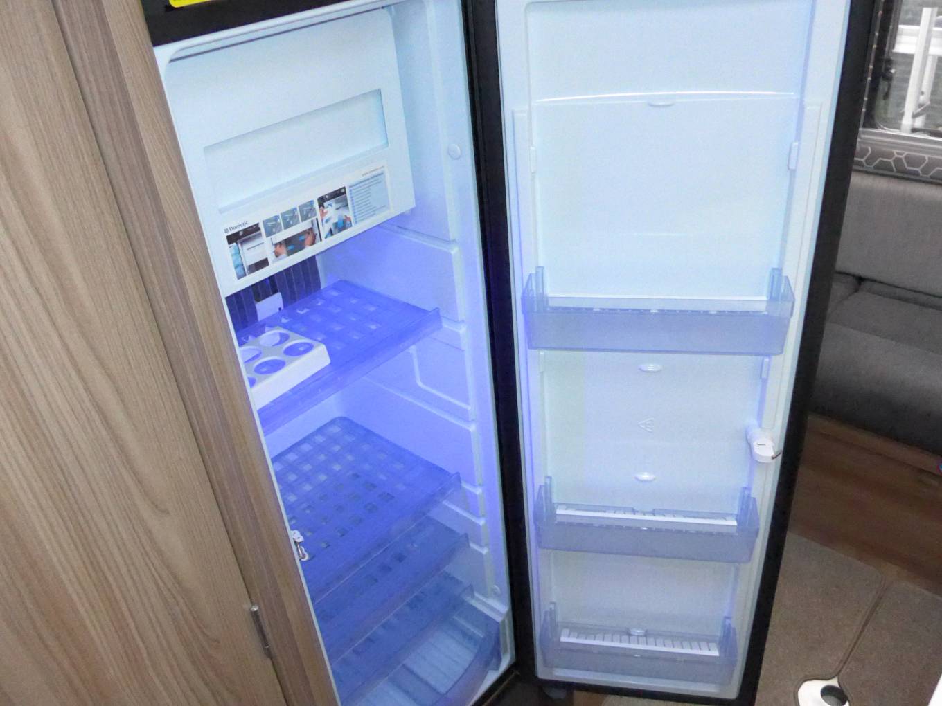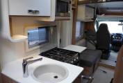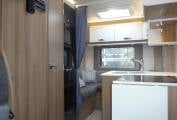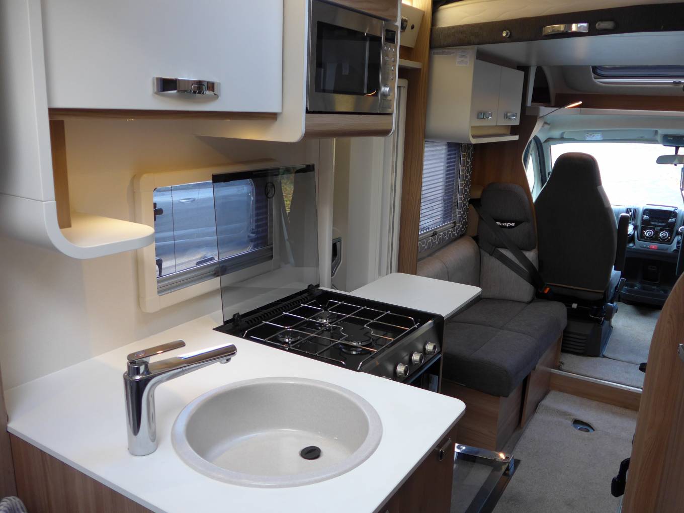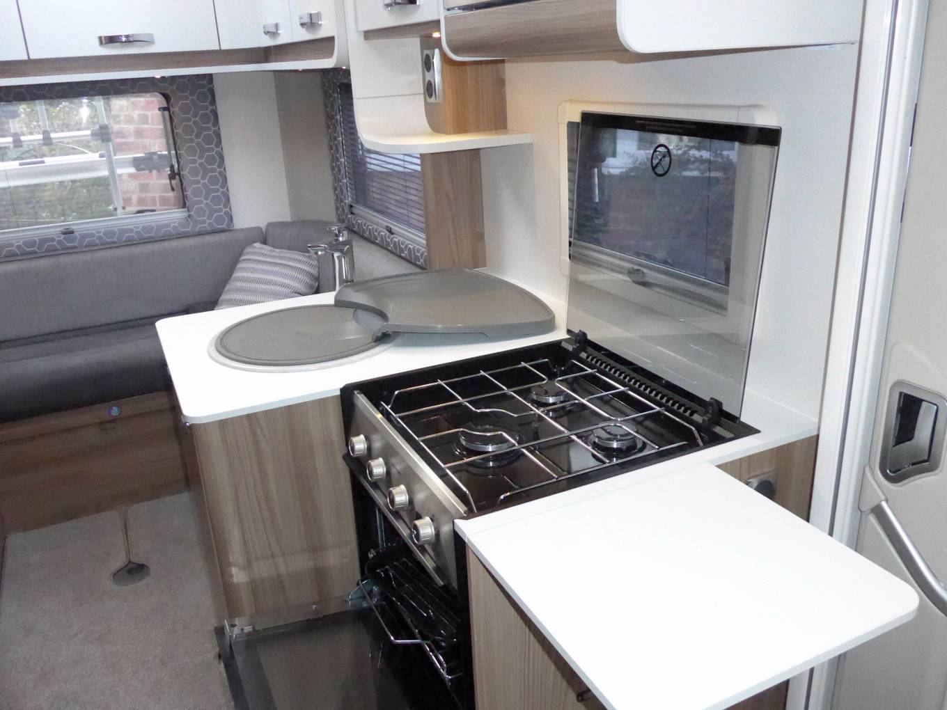 Kitchen with Combination thermostatic oven and grill with electronic ignition and 3 burner gas hob with electronic ignition. Microwave oven, Smoke alarm, Carbon monoxide alarm, large Domestic 138 litre slim line fridge with 230V, gas and 12V operation, Granite effect moulded kitchen sink, L shaped Kitchen work top extension flap, Removable drainer and food grade nylon chopping board nestle together for easy storage in dedicated location, Vector chrome effect kitchen mixer tap. LED strip lighting in china locker.