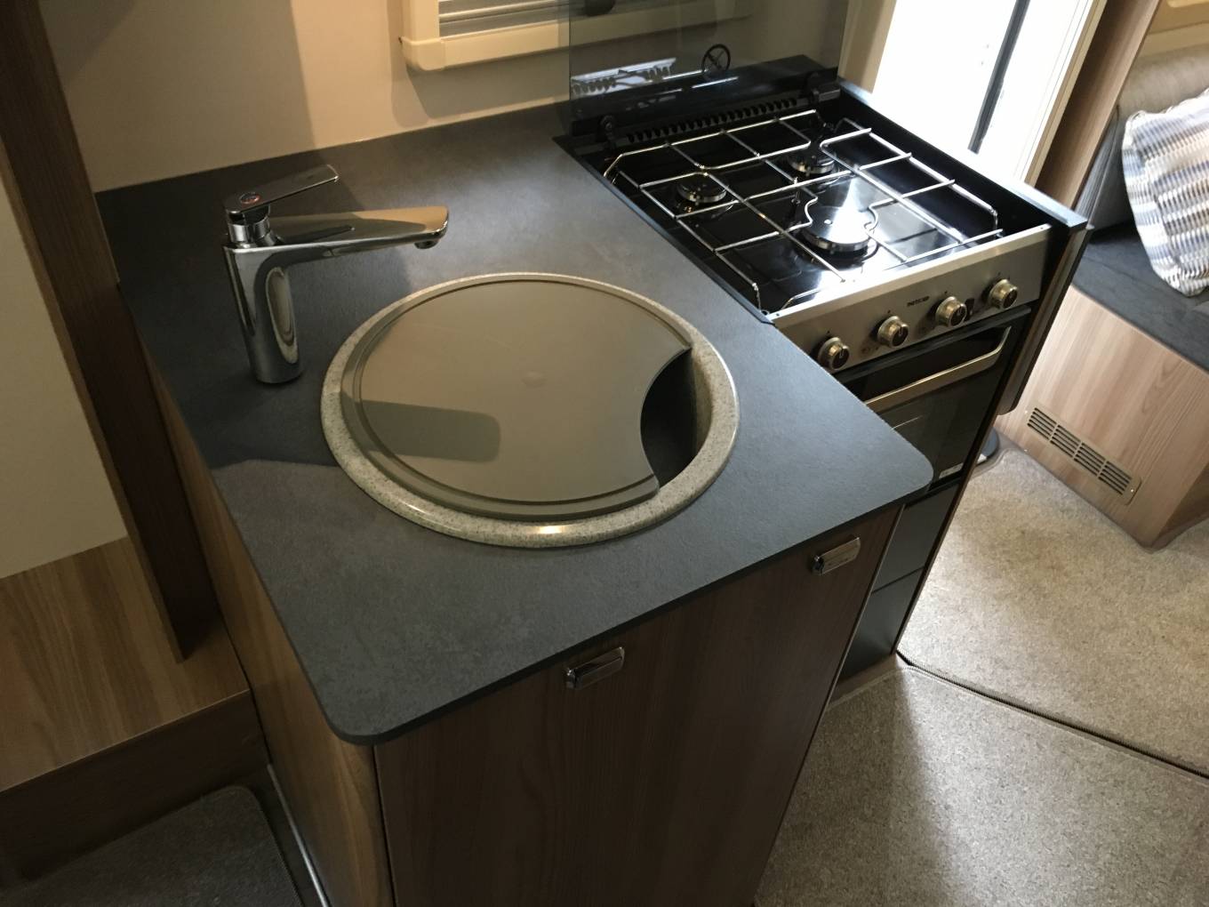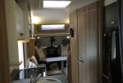 Enter through the habitation door and you have the kitchen to your right, with a circular sink and chrome mixer tap, a Thetford three gas burner hob and Thetford gas grill and oven combination below, opposite there is an auto energy source Dometic fridge with a integral freezer unit above and there is a built in microwave with digital controls. Good work surfaces and storage cabinets throughout.