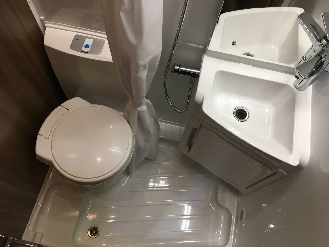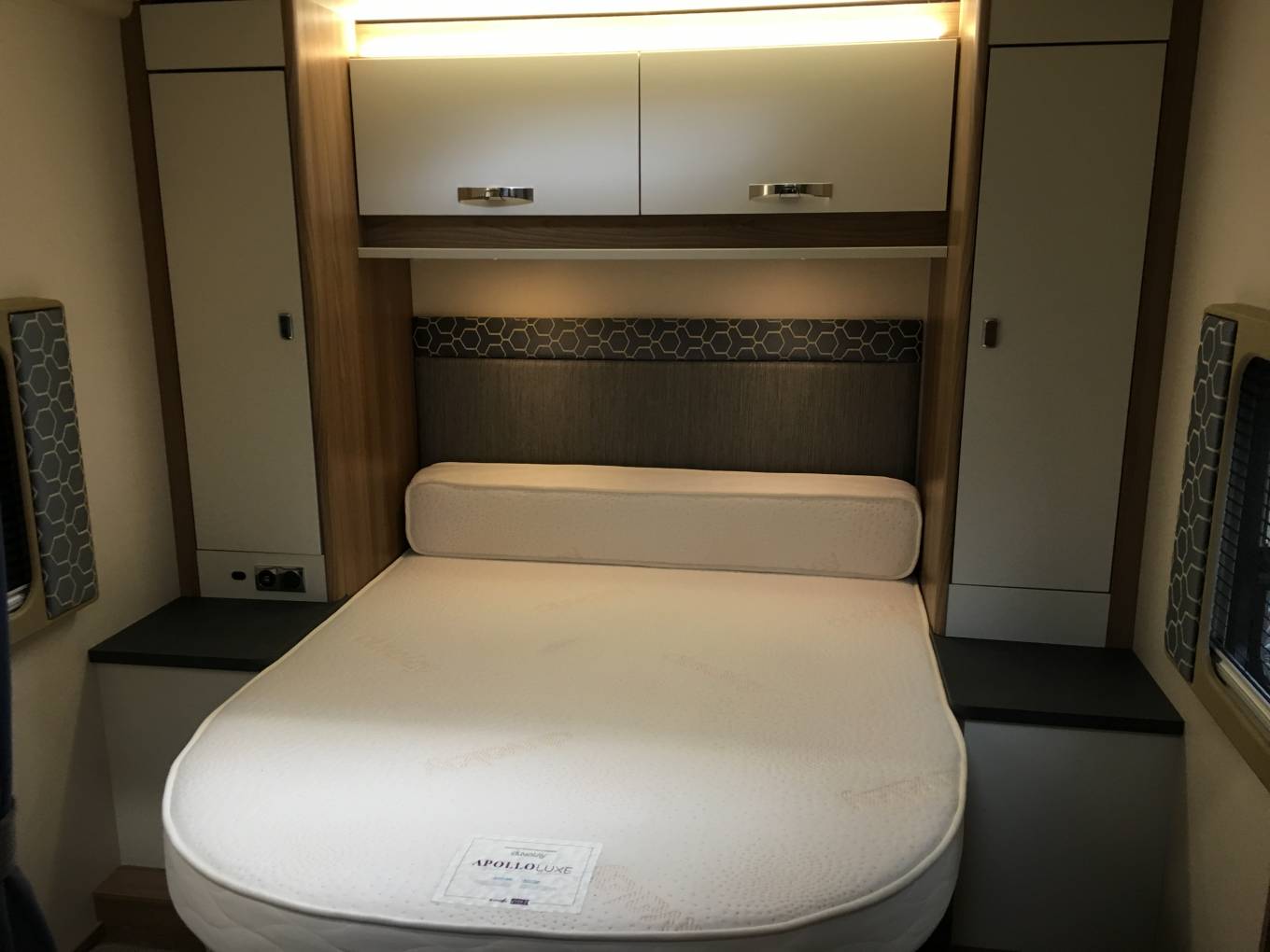 The central side washroom includes an integral shower with an Ecocamel Orbit shower head, vanity washbasin with a chrome mixer tap, a Thetford cassette swivelling toilet and a medicine cabinet and mirror. The generous sized double island bed with a Duvulay Apollo Luxe mattress is at the rear with easy access to both sides of the bed, side windows and overhead reading lights, overhead and wardrobe storage along with great storage underneath the bed.